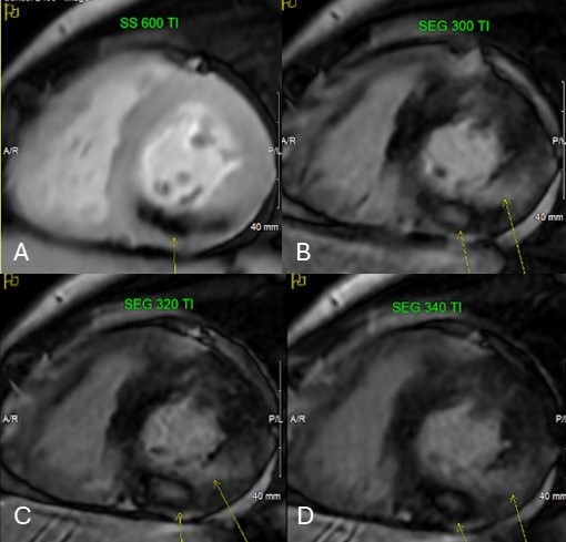 Figure 3: A. Inversion recovery image at higher inversion time of 600 msec showing area of microvascular obstruction (arrow) within the myocardial wall. Same area at usual inversion time of 300 msec (B), 320 msec (C) and 340 msec (D) (small arrow) showing well demarcated region of hyperintensity suggesting no contrast uptake. The long arrows indicate subendocardial to near transmural late gadolinium enhancement.