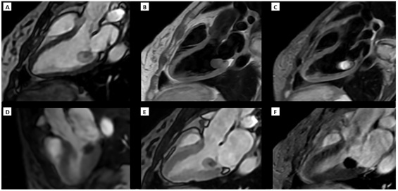 Figure 2. RMC findings: Three-chambers view. A) Cine SSFP sequence: Mass firmly attached to the ventricular surface of segment P1 of the posterior mitral leaflet, cystic in appearance, with mixed content (solid and liquid) and limited mobility. B) FSE T1 sequence: isointense and C) FSE T2 STIR sequence: hyperintense relative to myocardium. D) First-pass gadolinium sequence without perfusion. E) and F) PSIR sequences at early and late gadolinium enhancement respectively without enhancement.
