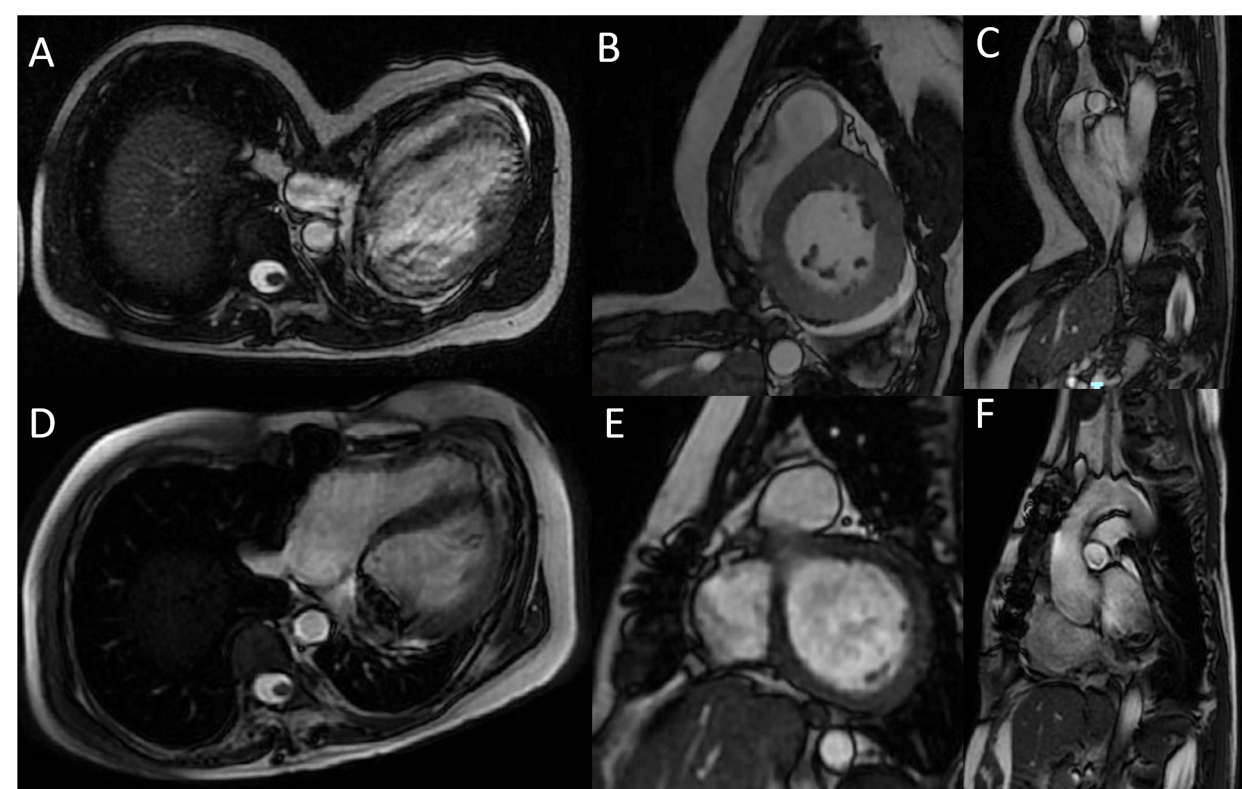 Fig. 2: A-B-C.- Presurgical CMR. D-E-F.- Postsurgical CMR