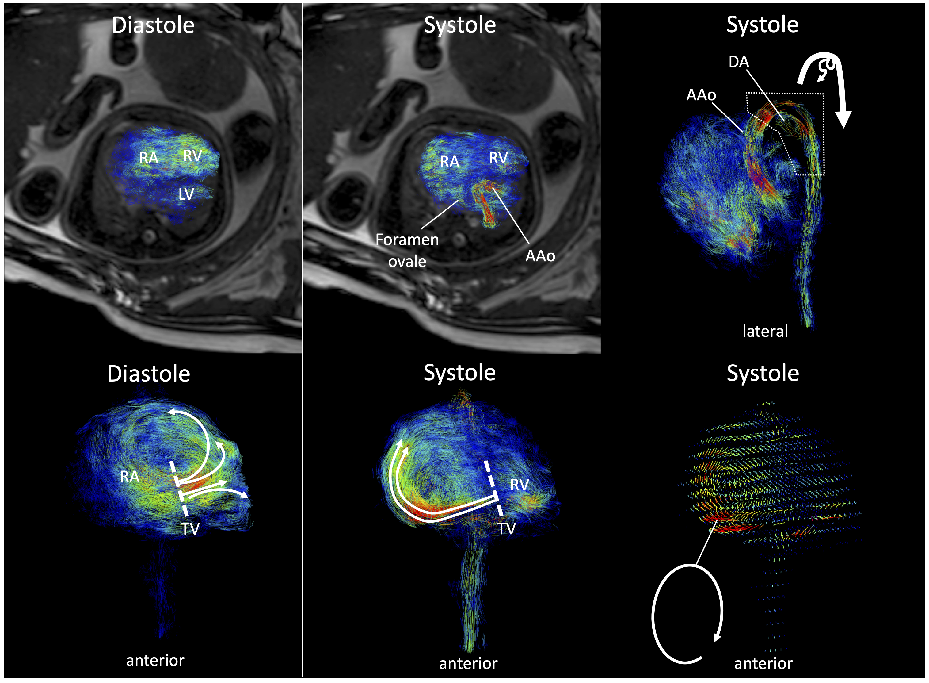 Images from a fetus with severe Ebstein anomaly and a circular shunt at 36 weeks of gestation (fetus 31). Diastole: (Top) 4D flow pathline visualization and axial cine overlay shows filling of the left ventricle (LV) and the enlarged right ventricle (RV). (Bottom) An anterior 4D flow pathline view highlights blood flow distribution from the right atrium (RA) across the anteriorly displaced tricuspid valve (TV), primarily directed cranially toward the right ventricular outflow tract. Systole: (Top left) The LV ejects blood into the ascending aorta (AAo), while RV blood predominantly regurgitates back into the RA via the insufficient TV, crossing the foramen ovale into the left heart. (Top right) Pathline visualization reveals absent antegrade flow in the main pulmonary artery and retrograde perfusion of the hypoplastic ductus arteriosus (DA) from the aortic arch, forming a circular shunt pathway (AAo → DA → RA → foramen ovale → LV → AAo). (Bottom left) Pathline visualization and (bottom right) velocity vectors depict massive retrograde flow from the RV into the RA through the insufficient TV, generating a prominent vortical flow pattern within the RA. The ability to visualize complex, multidirectional flow patterns enabled the identification of the circular shunt in this fetus, which would likely have been missed using 2D flow imaging alone.