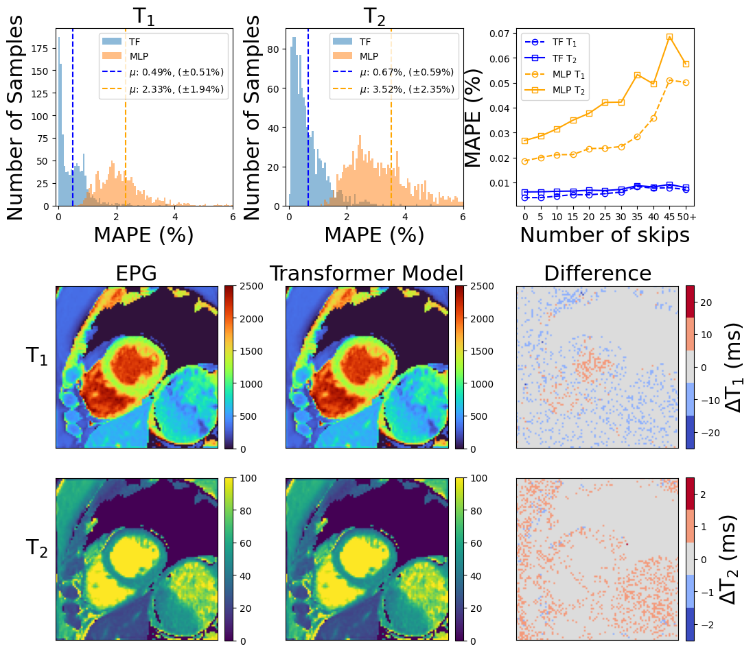 Figure 3. A Histograms of T1 and T2 MAPE across all test patients, comparing the dictionaries for the Transformer and the baseline MLP model. Bin size 0.06. B Average MAPE per number of total skips (due to navigator rejection or ECG trigger detection failure) during the scan, for both models, bin size 5. C Exemplary comparison of maps created with the PARMANav EPG dictionary and the PARMANav Transformer dictionary. D Difference plot (Transformer Model - EPG). The maps are visually identical.