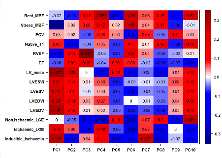 Figure 1: Eigencor plot showing principal components 1-10 correlated against selected CMR parameters. The scale denotes R values with asterisks representing p<0.05.