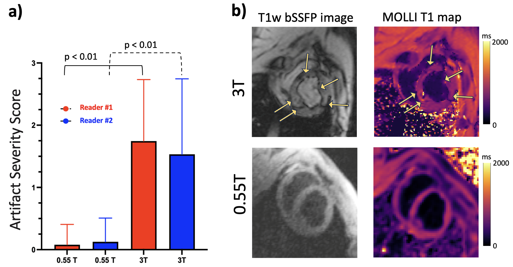 Figure 3: Evaluation of susceptibility and banding artifacts in MOLLI T1 maps at 0.55T versus 3T. (a) Artifact severity was scored by two blinded readers across 108 images using a 0–3 scale (0 = no artifacts, 3 = severe artifacts). The average scores were significantly lower at 0.55T (0.10 ± 0.35) compared to 3T (1.64 ± 1.11), indicating reduced artifact burden at the lower field strength (p < 0.01). (b) Sample T1-weighted bSSFP images (left) and corresponding MOLLI T1 maps (right) acquired at 3T (top) and 0.55T (bottom) illustrate this difference. Yellow arrows highlight susceptibility and banding artifacts visible at 3T but absent at 0.55T, underscoring the advantage of low-field imaging in minimizing artifact-related degradation.