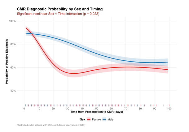 Figure 2. CMR diagnostic probability by sex and timing showing significant nonlinear Sex x Time interaction.