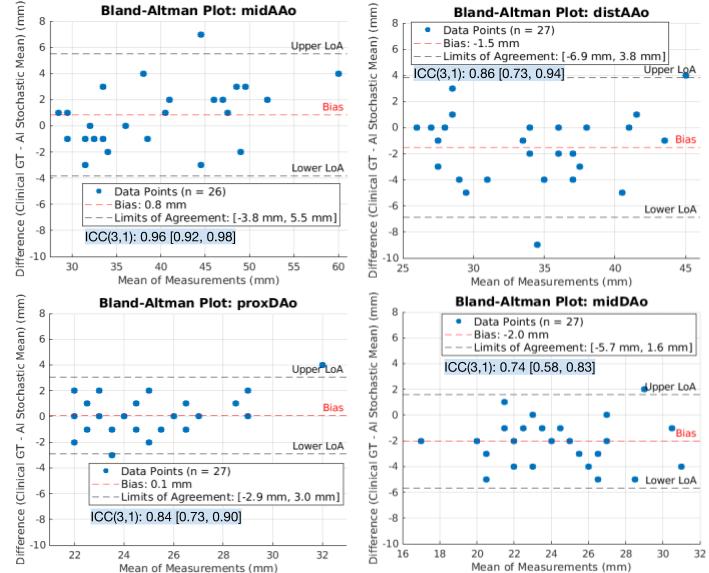 Figure 3: Validation of automated aortic diameter measurements against manual ground truth at four key anatomical locations (n=26-27 paired measurements). Mid-ascending aorta (midAAo) shows excellent reliability (ICC(3,1)=0.96, 95% CI: 0.92-0.98) with minimal bias (0.8 mm) and mean absolute error of 2.0 mm. Proximal descending aorta (proxDAo) shows good agreement (ICC(3,1)=0.84, 95% CI: 0.73-0.90) with negligible bias (0.1 mm) and excellent precision (93% of measurements within ±2 mm). Underestimation is observed at the distal ascending aorta (distAAo; bias=-1.5 mm, ICC(3,1)=0.86) and mid-descending aorta (midDAo; bias=-2.0 mm, ICC(3,1)=0.74). Limits of agreement ranged from ±3.0 mm (proxDAo) to ±5.4 mm (distAAo).