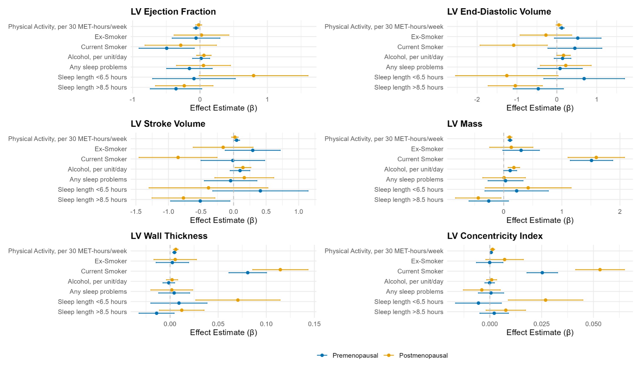 Figure 2. Associations of lifestyle factors with cardiac remodeling in pre- and postmenopausal women: forest plots of adjusted models.
