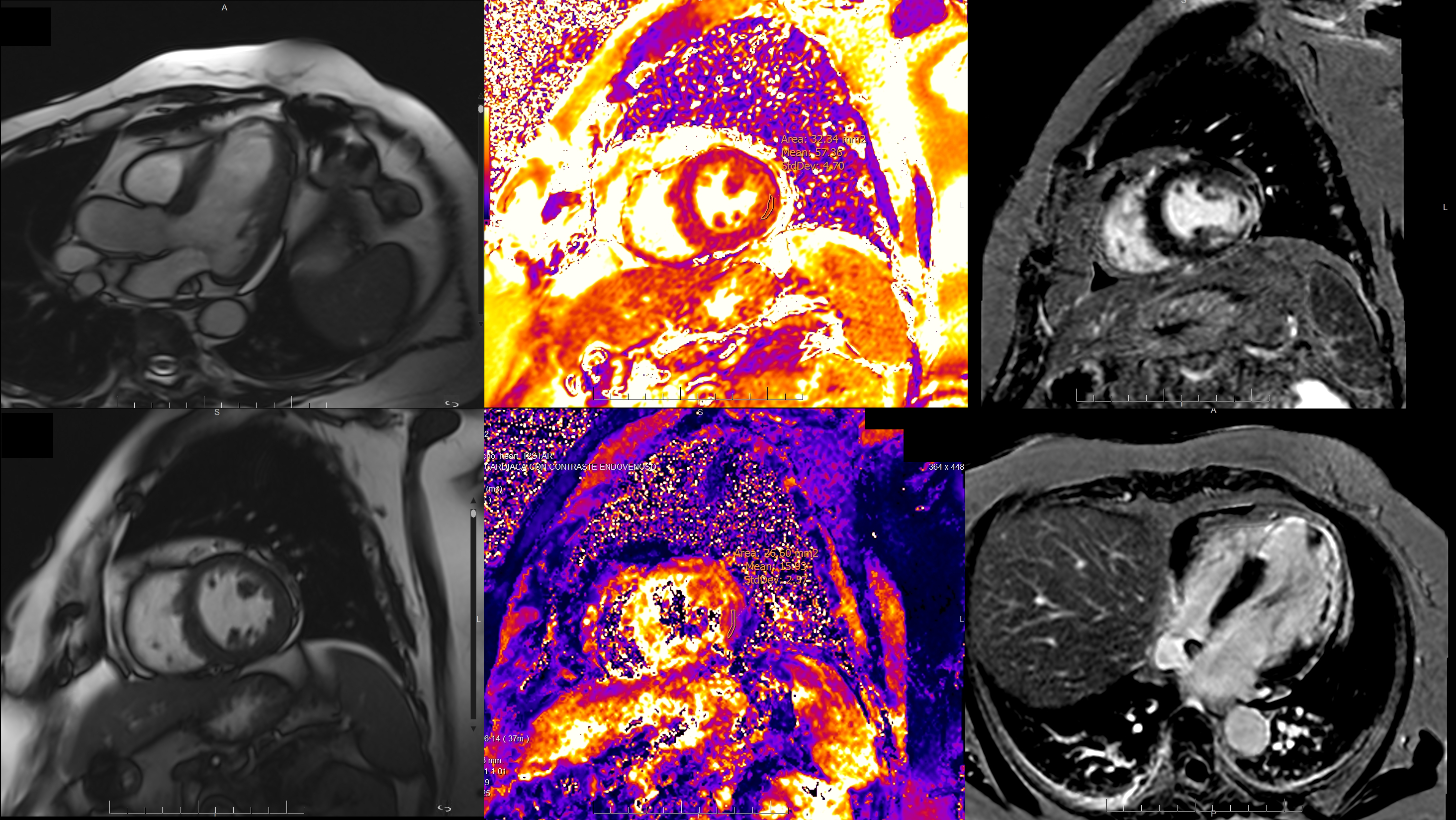 Figure 3. CMR findings: apical aneurysm, microvascular obstruction, and mural thrombus in four-chamber view (LGE). Lateral wall edema (T2 mapping) and intra-infarct hemorrhage (T2* mapping) in short axis at mid-ventricular level and three-chamber view.