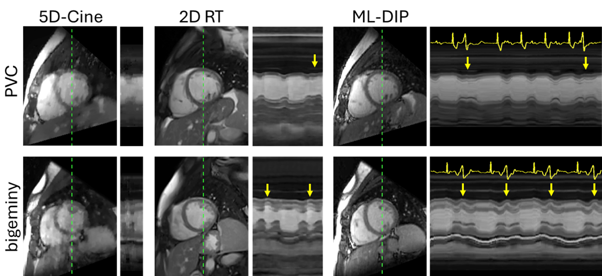 Figure 2: Representative short-axis images from 5D-cine, 2D RT, and ML-DIP. Space-time (x-t) profiles along the dashed green lines are shown to the right of the images. The ML-DIP x–t profiles span 200 frames (6.6 s), while the x-t profiles span 3 seconds for 2D RT cine and one cardiac cycle for 5D-Cine. The 3D reconstructions from 5D-Cine and ML-DIP were interpolated along the 2D plane defined by the 2D RT acquisition. Significant motion artifact is observed in 5D-Cine. The arrows indicate PVC beats. The synchronous ECG is plotted in yellow.