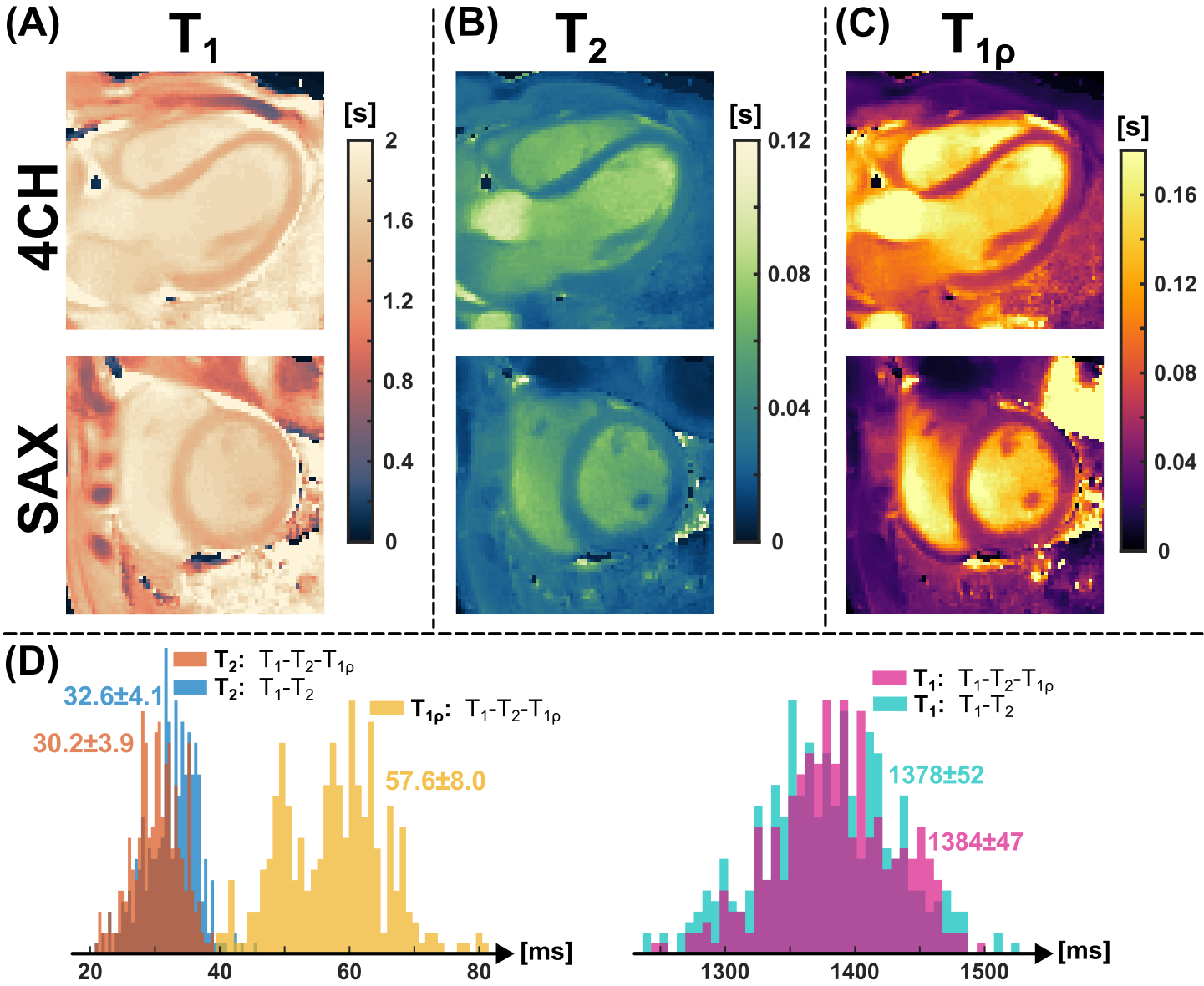 Figure 3) Results from in vivo scans on a 3 T Siemens Skyra. Panels A–C illustrate relaxation time maps in a four-chamber view (upper row) and a short-axis view (bottom row). The matched parameter maps exhibit good image quality. Panel D compares left ventricular values with those from a widely used cMRF sequence encoding only T1 and T2 [1]. No systematic differences were found between the conventional and extended T1–T2–T1ρ variants.