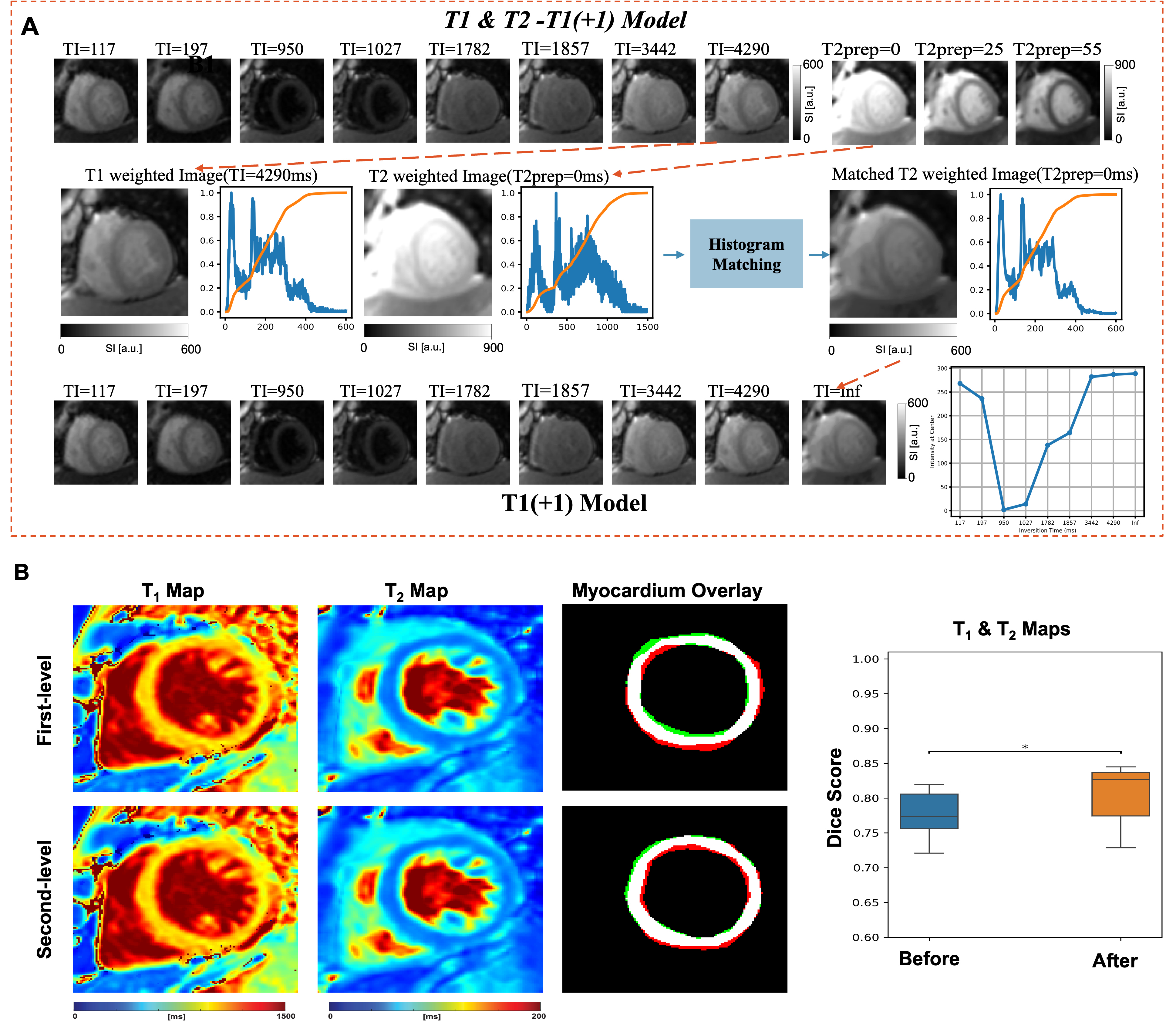 Figure 3 Second-level inter-series registration performance. (A) The T1+(1) physics model was applied in the second level for inter-subject registration between T1 and T2 weighted images. This approach treats the first T2-weighted image as a fully recovered T1-weighted image. The images were preprocessed using histogram matching to normalize the intensity difference between the imaging protocols. The combined series, including all T1-weighted images and the intensity-matched first T2-weighted image, then serves as input to the second-level registration. (B) Representative images and dice score comparison of T1 and T2 maps before and after the second level registration. The red and green masks denote the T1 and T2 mapping's myocardial masks and the white region denote the overlay region. The statistical results showed significant improvement in the dice score after registration.
