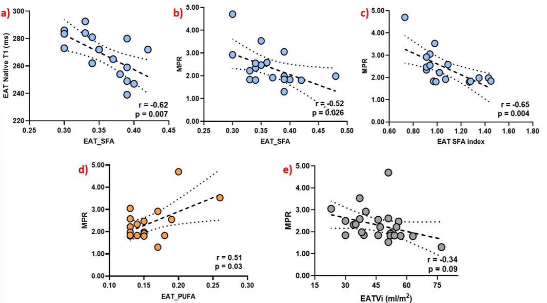 Figure 2. Linear regression plots demonstrating associations between epicardial adipose tissue (EAT) fatty acid composition and cardiovascular magnetic resonance (CMR) parameters. Significantly good correlations observed between EAT SFA fraction and native EAT T1 (a), EAT SFA fraction and myocardial perfusion reserve (MPR) (b), EAT SFA index and MPR (c), and EAT PUFA fraction and MPR (d). No significant correlation was observed between EAT volume index (EATVi) and MPR (e).