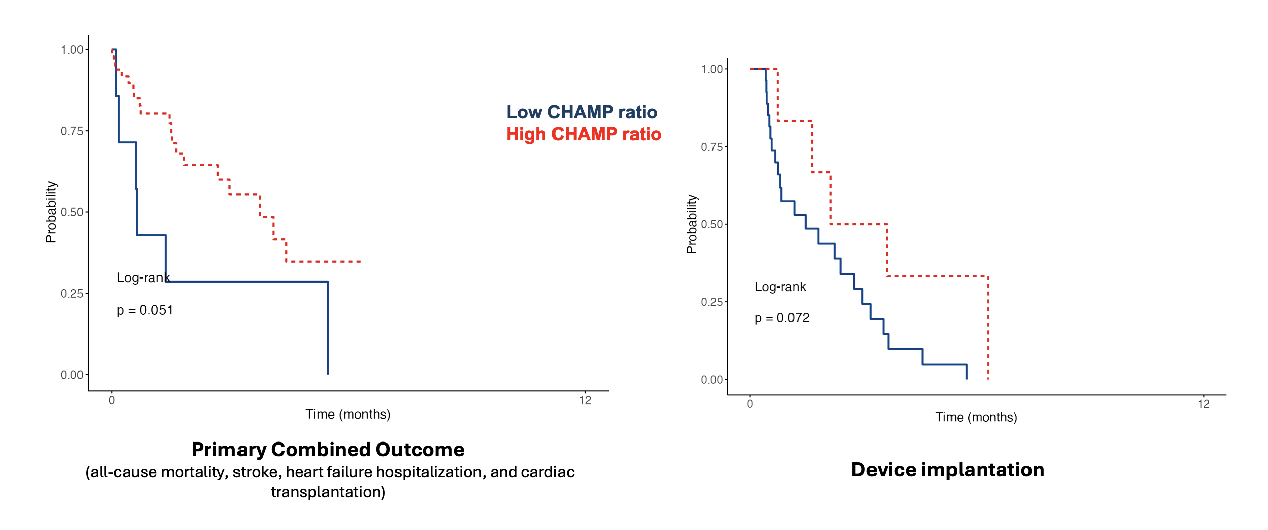 Kaplan–Meier survival curves in patients with chronic Chagas cardiomyopathy according to CHAMP ratio.