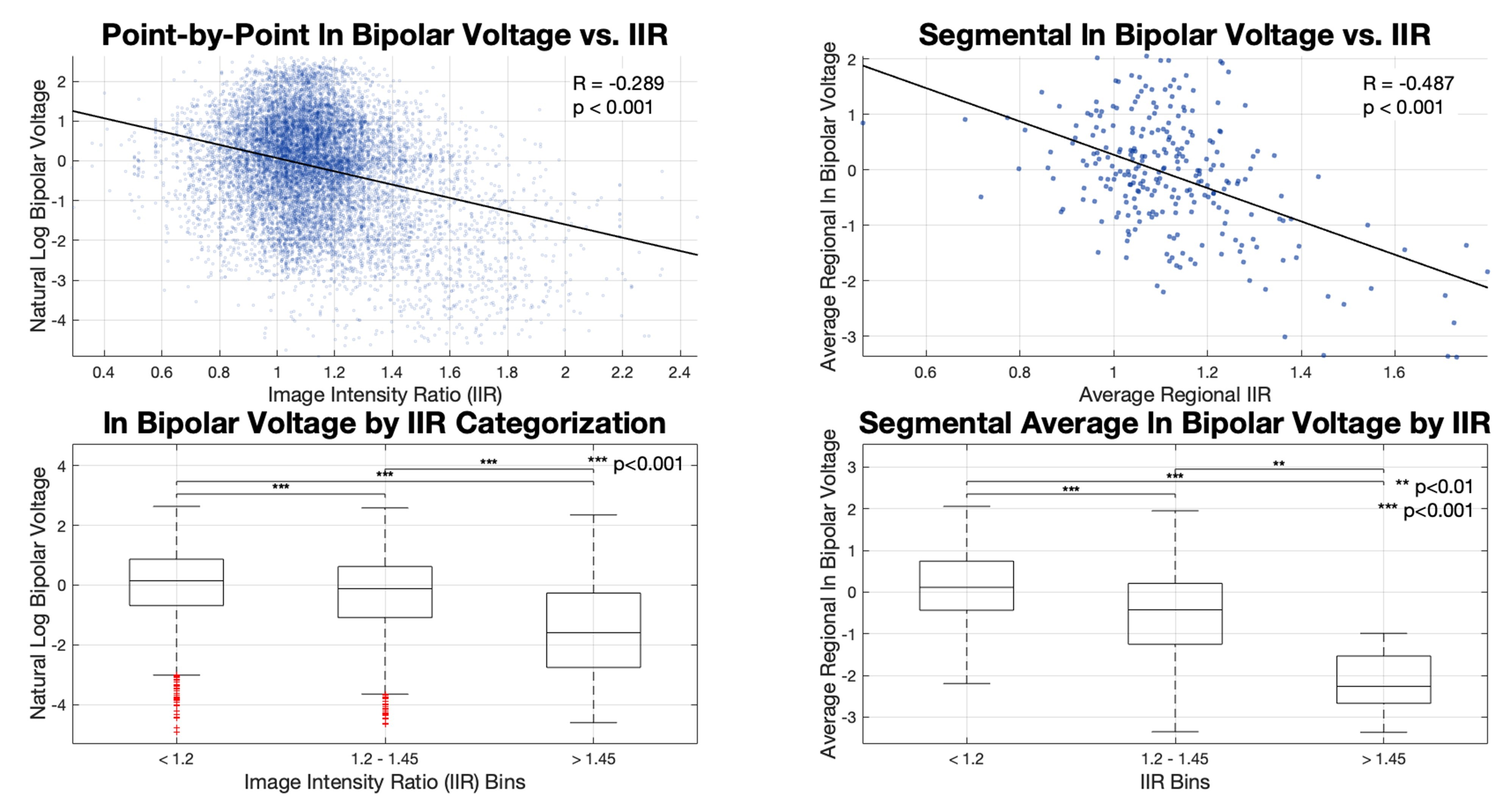 Point-by-point and segmental IIR-bipolar voltage correlation approaches. TOP: Scatter plots of all posterior wall IIR-EAM pairs (left) and nonzero IIR-EAM segments (right). BOTTOM: Natural log-transformed bipolar voltage boxplot ranges sorted by Image Intensity Ratio. IIR < 1.2 is considered “healthy”, IIR 1.2-1.45 is considered “scarred”, and IIR > 1.45 “densely scarred”, using published language from Benito et al (5).