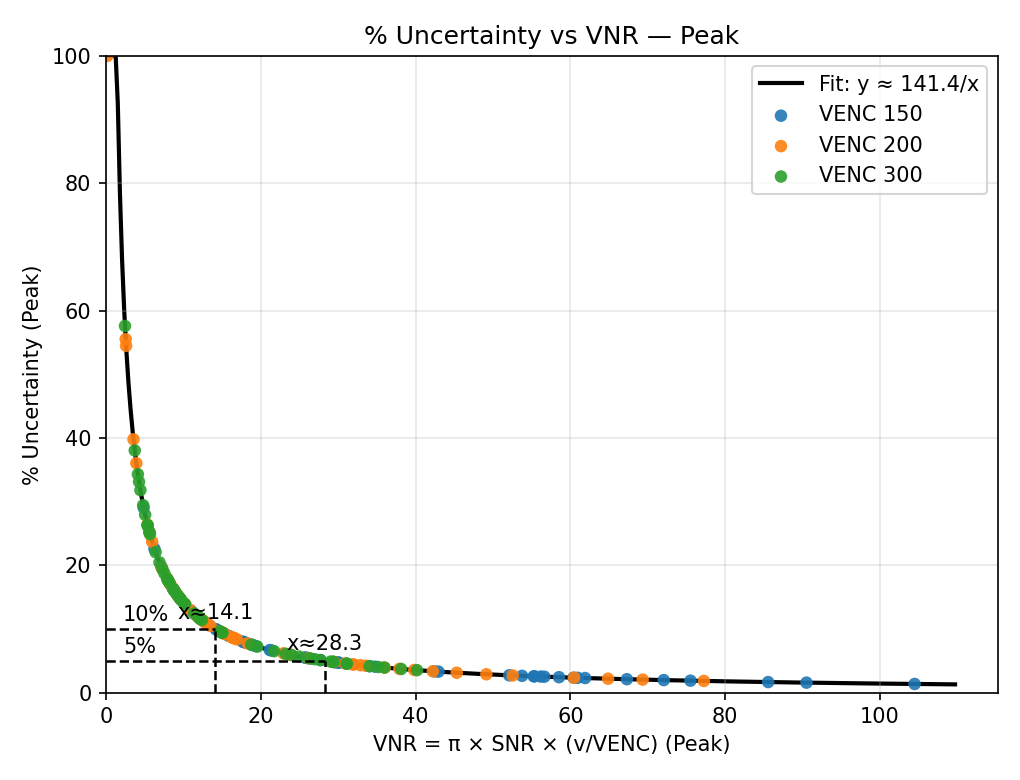 Figure 3. Relationship between VNR and the percent uncertainty of peak velocity measurements. Data follow a hyperbolic inverse relation. Dashed black reference lines indicate the thresholds for 10% and 5% uncertainty.