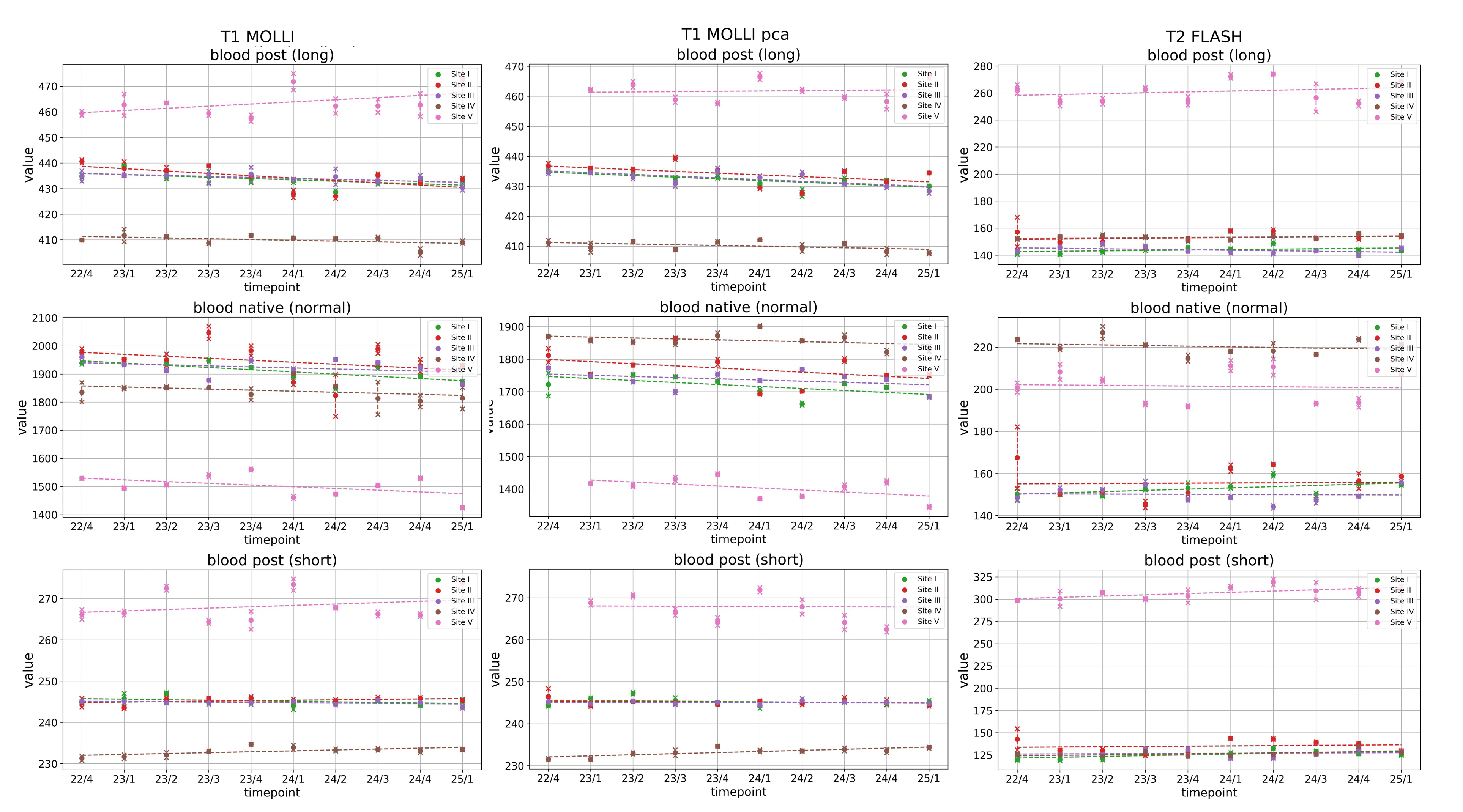 Figure 2: Linear regression for tubes mimicking blood pre (middle row) and post contrast agent (upper row: long, lower row: short) for T1 MOLLI native (left column), T1 MOLLI post contrast agent (pca, middle column) and T2 (right column) respectively. The individual sites are color-coded. Timepoints are given in the format year/quarter from the fourth quarter in 2022 to the first quarter in 2025.