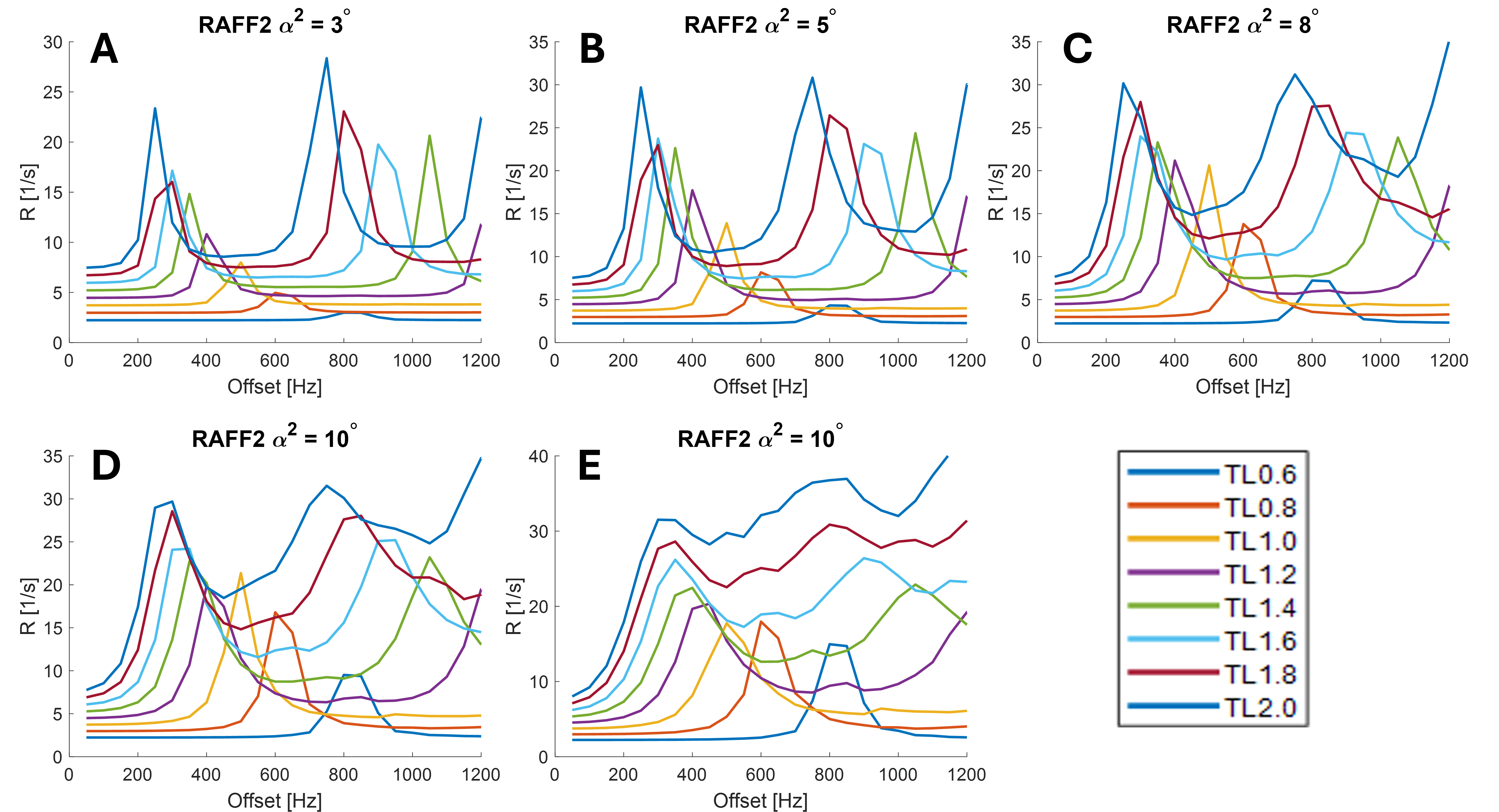 Figure 3. The results of the simulations show the offset resonance side bands of different durations of the RAFF2 pulse with specific a(2) angle. In the figure, there are RAFF2 with a(2) angle of 3° (A), 5° (B), 8° (C), 10° (D) and 15° (E).