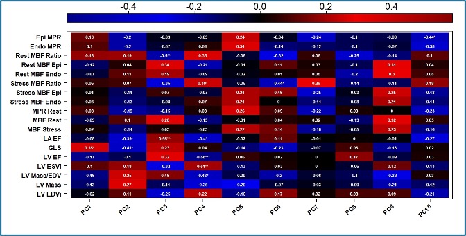 Figure 2: Eigencor plot showing the correlation between principal components (1-10) on the x axis and cardiac MRI parameters from patients’ follow up study visit on the y axis. Colours indicate the strength and direction of the correlation, with red representing positive correlations and blue representing negative correlations. The scaled bar on the right represents correlation coefficients, and significance levels are denoted by asterisks (*p < 0.05, **p < 0.01, ***p < 0.001). PC, principal component; LVEDVi, indexed left ventricular end diastolic volume; LV Mass EDV, left ventricular mass to end diastolic volume ratio; LVESVi, left ventricular end systolic volume indexed; LVEF, left ventricular ejection fraction; GLS, global longitudinal strain; Atrial EF, atrial ejection fraction; MBF Stress, stress myocardial blood flow; MBF Rest, rest myocardial blood flow; MPR rest global, global myocardial perfusion reserve; Stress MBF Endo, endocardial stress myocardial blood flow; Stress MBF Epi, epicardial stress myocardial blood flow; Stress MBF Ratio, stress myocardial blood flow ratio; Rest MBF Endo, endocardial rest myocardial blood flow; Rest MBF epi, epicardial rest myocardial blood flow; Rest MBF ratio, rest myocardial blood flow ratio; Endo MPR, endocardial myocardial perfusion reserve; Epi MPR, epicardial myocardial perfusion reserve.