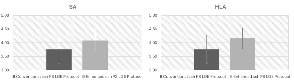Figure 3. Comparison of image quality scores for ssh PS LGE acquired using conventional and enhanced protocols (n = 25). On the short-axis (SA) plane (left), the mean score was 4.08 ± 0.49 for the enhanced protocol versus 3.76 ± 0.52 for the conventional protocol (p < 0.05). On the 4-chamber (4CH) plane (right), scores were 4.16 ± 0.37 versus 3.76 ± 0.52, respectively (p < 0.01).