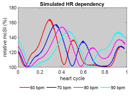 Figure 2: Heart rate (HR) dependency of the simulated myocardial signal intensity (mcSI) when modelling the cine magnetisation for through-plane motion as typical in healthy subjects. The horizontal axis is one cardiac cycle, as on the Figure 1 graphs. Although the heart rate changes significantly from baseline to recovery, or, between severe and moderately reduced EF (table 1), the in vivo change in mcSI (Fig. 1, top) are larger than the simulations predict and are correlated with functional parameters (Fig. 1, bottom).