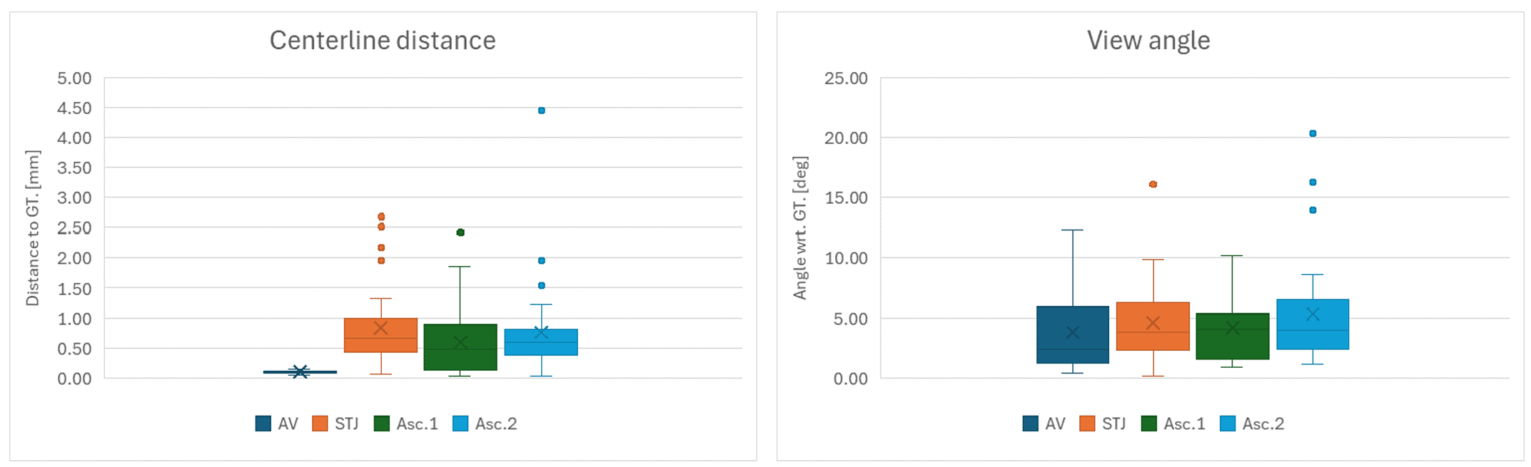 Figure 2: Box-whisker plots of the centerline distance and the flow measurement view angle discrepancy with respect to the four ground truth landmarks defined by the cardiologist.