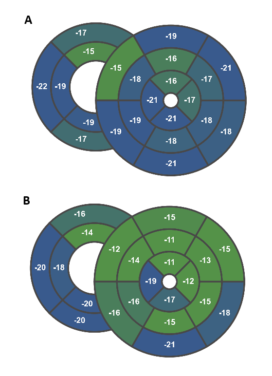 Polar plots of longitudinal strain in healthy control subject (A) and in PHT recipient (B). Strain values are visually represented along a color scale, with green depicting areas of abnormal strain compared to normal (blue).