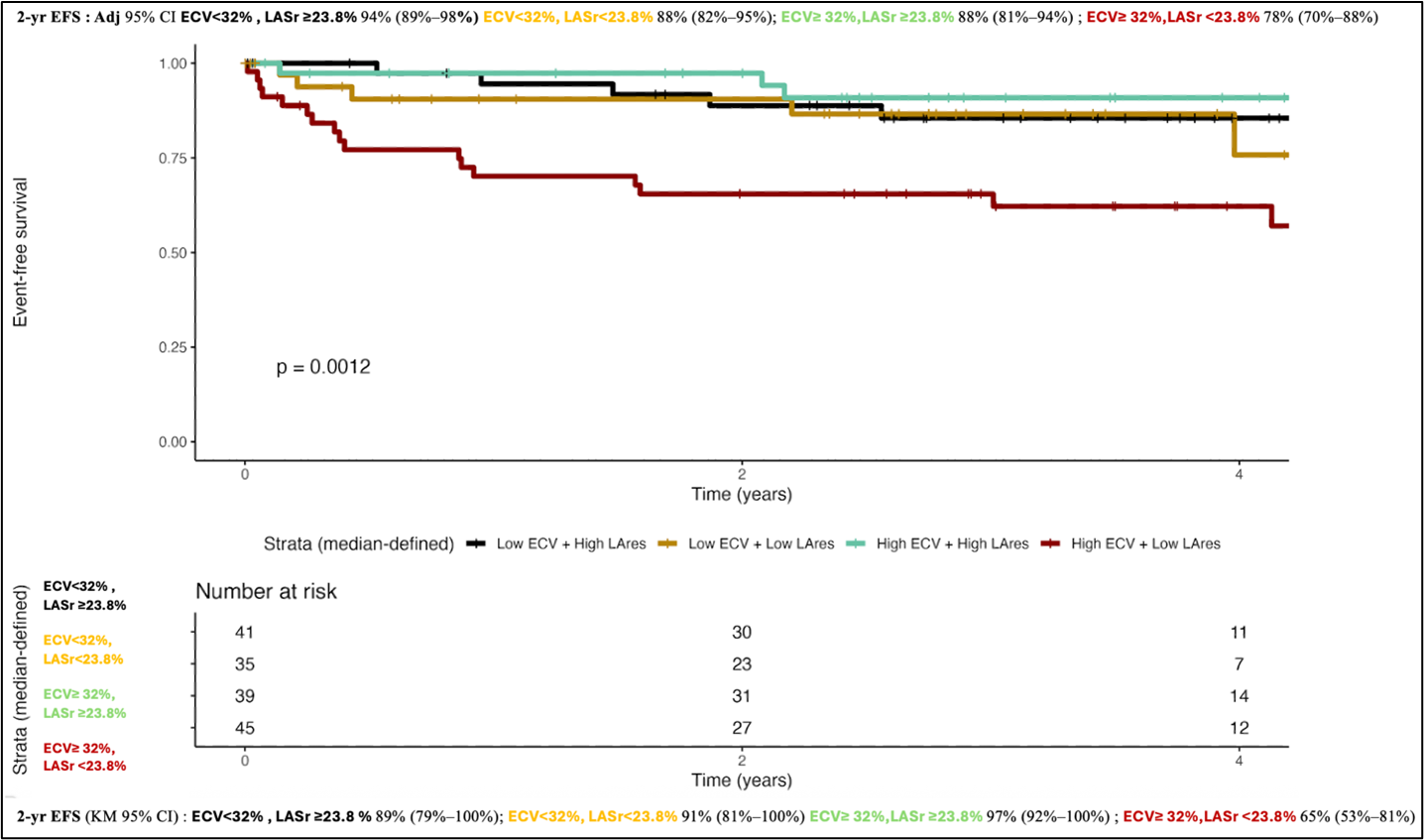 Fig. 2. Kaplan–Meier event-free survival by combined ECV and LA reservoir (LASr) strata & numbers at risk shown below. Cut points (medians, n=160): ECV 32.0%; LASr 23.8%; (Cohort means: ECV 33.1%; LASr 24.9%). Numbers at risk are shown beneath the plot. The higher risk occurs with high ECV+ low LA reservoir strain (red): 2-yr EFS: 65% , (53-81%), while preserved LA mechanics attenuate risk when ECV is high (green) 97% (92-100%)