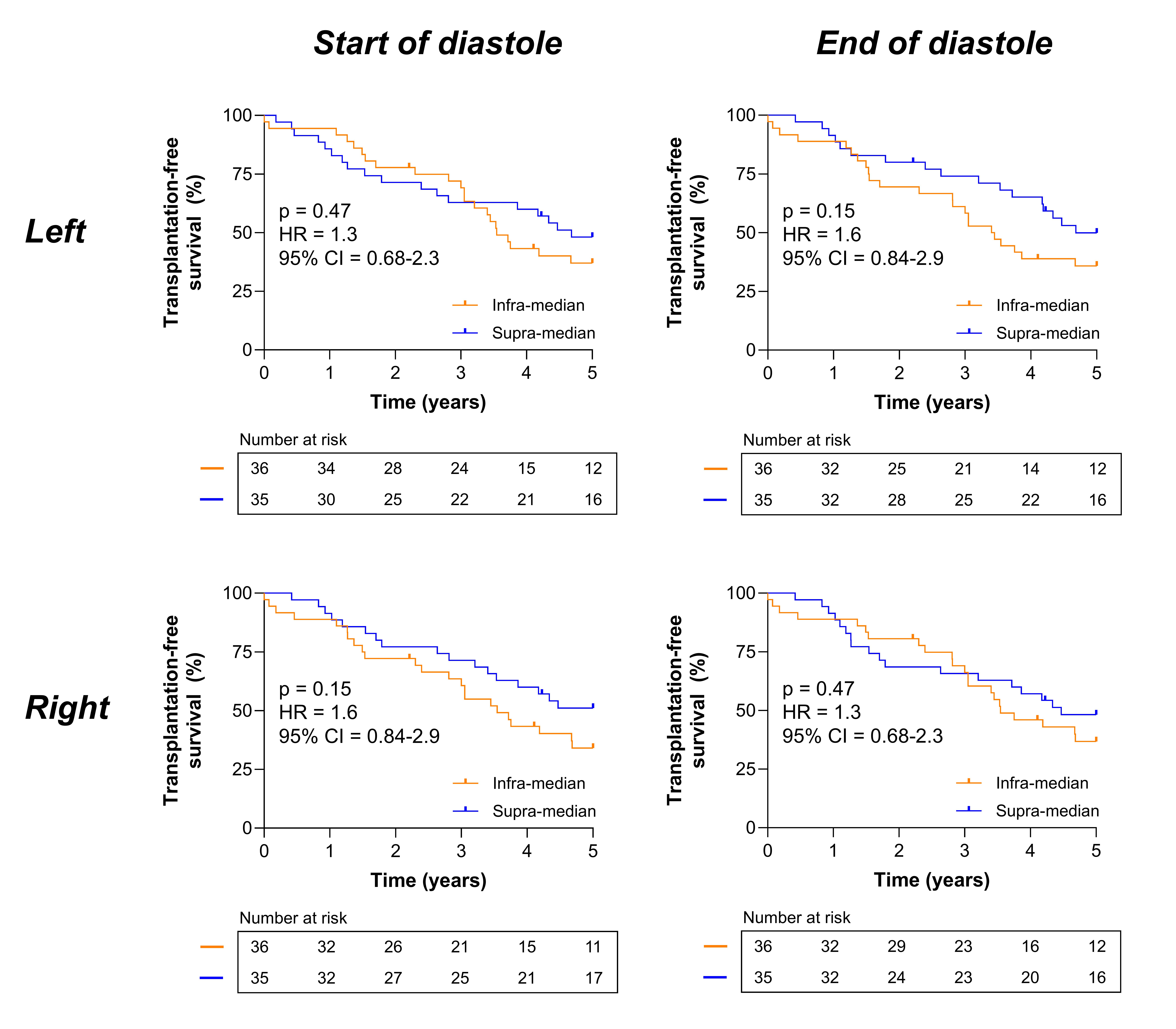 Figure 2. Transplantation-free survival in patients with PAH in groups of infra- and supra-median atrioventricular area difference (AVAD), for the left side (top panels) and the right side (bottom panels), at the start and end of diastole. The p-values are derived from the logrank test. The reported hazard ratios (HR) correspond to infra-median vs. supra-median AVAD.