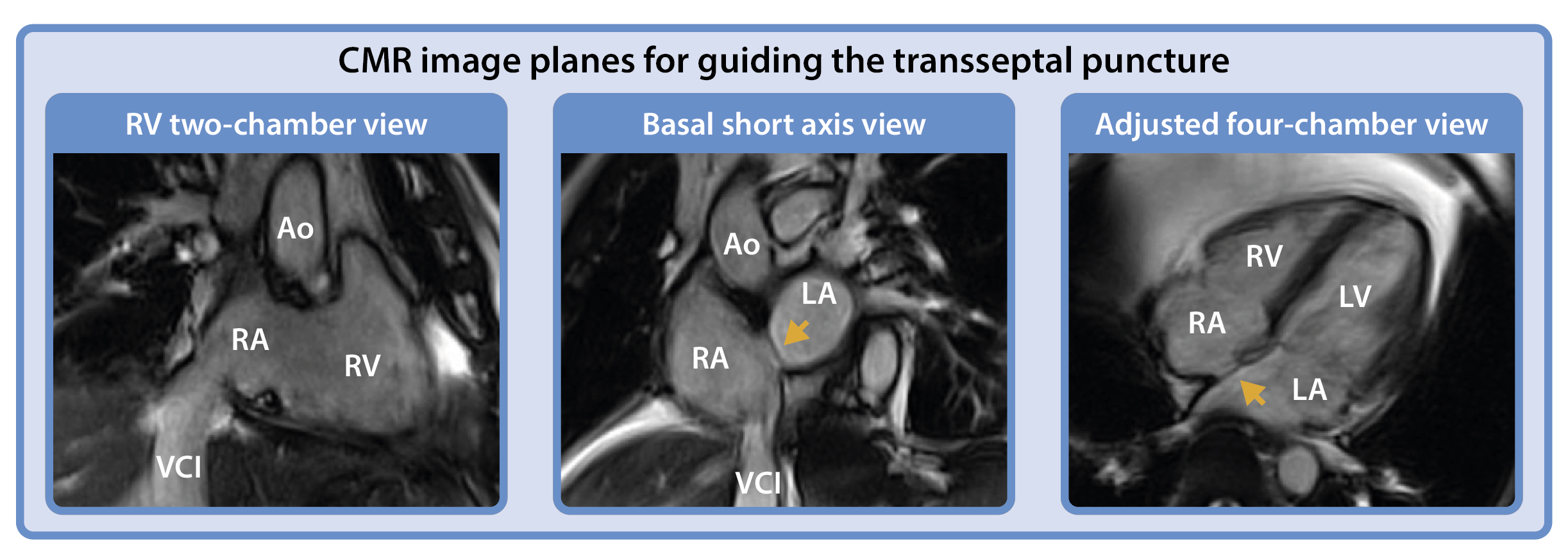 Right ventricular two-chamber view (comparable fluoroscopy orientation: right anterior oblique), basal short axis view (comparable fluoroscopy orientation: left anterior oblique), and four-chamber view. The yellow arrow indicates the foramen ovale.