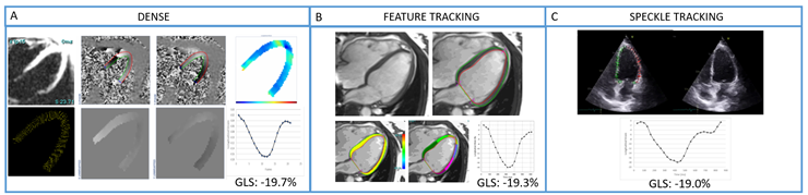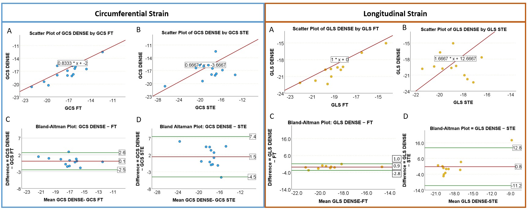 Figure 2. Comparison of Myocardial Strain Measurements by Feature Tracking (FT) and Speckle Tracking Echocardiography (STE) Against Displacement Encoding with Stimulated Echoes (DENSE). Top row: Scatter plots comparing global circumferential strain (GCS) (left panel) and global longitudinal strain (GLS) (right panel) values obtained by FT (A) and STE (B) versus the DENSE reference standard. Bottom row: Bland–Altman plots assessing agreement between DENSE and FT (C) and DENSE and STE (D) for GCS and GLS.