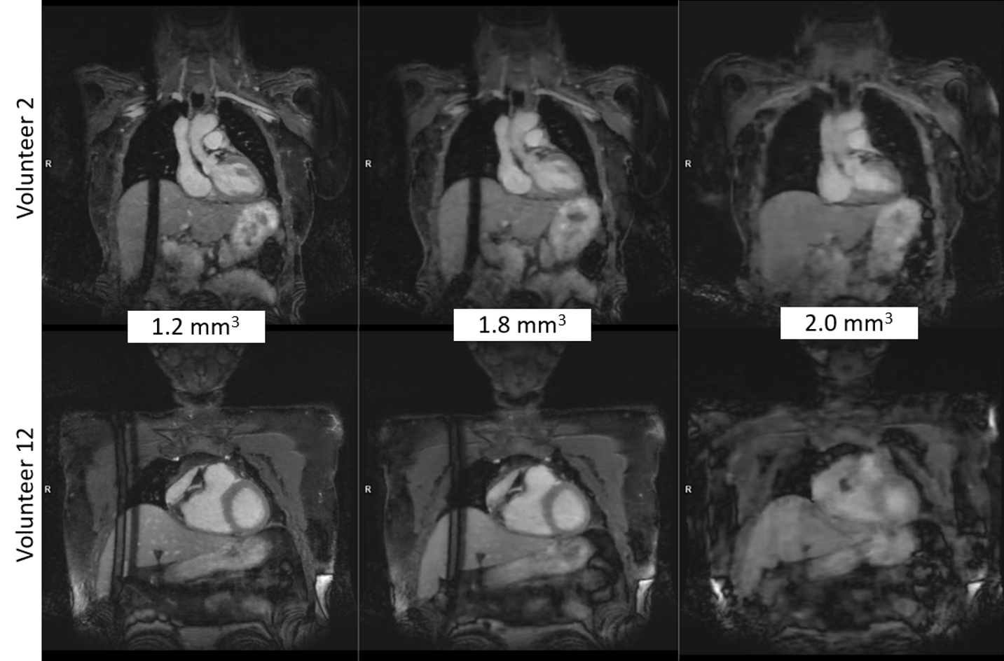 Figure 2: Examples of the 3D MRA image quality of two volunteers for all resolution variants. Volunteer 12 did not hold their breath until the end of the acquisition for the 2 mm^3 breath-hold variant, which resulted in lower image quality.