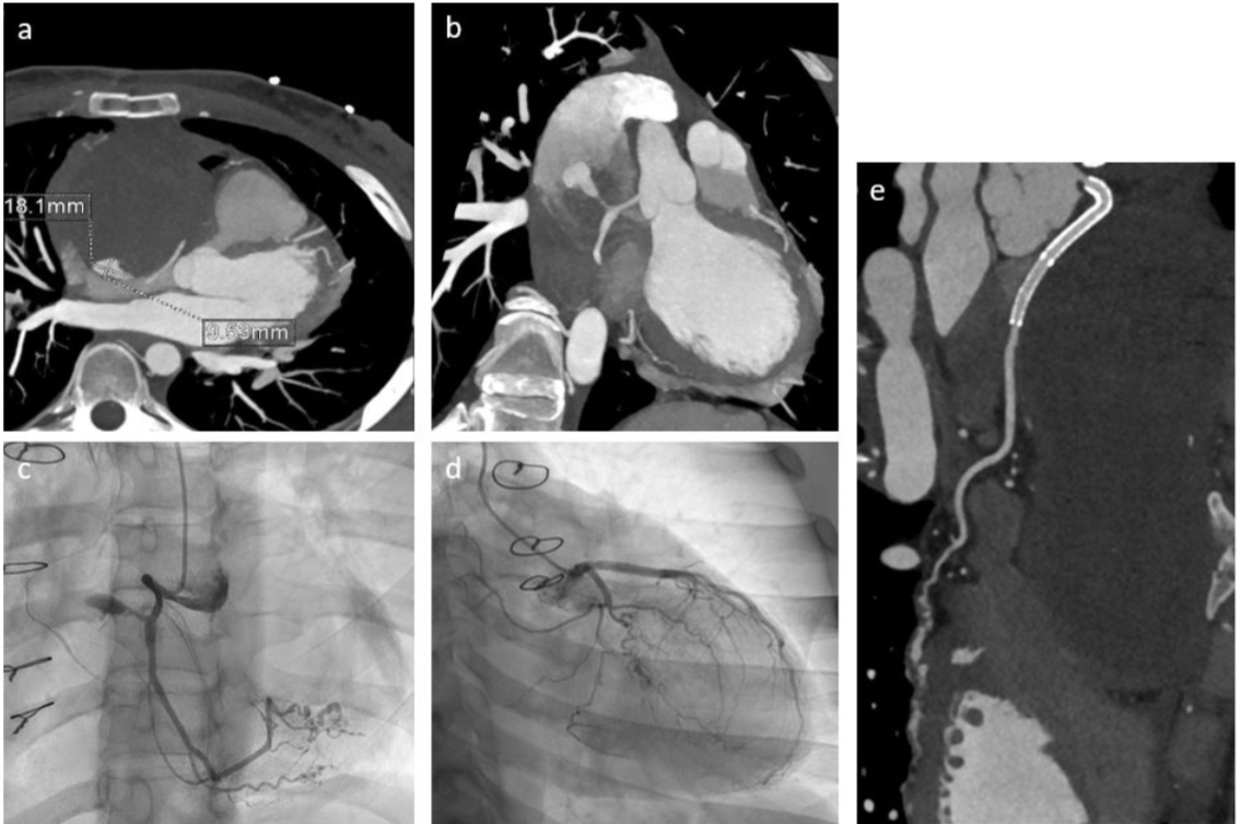 Axial (a) and coronal (b) MIP reformat images from CCT show a focal area of enhancement within the peripheric portion of the lesion, communicating with the right coronary artery trough a slender acute marginal branch/atrial branch; the same finding is confirmed by invasive coronary angiography (c-d) which also shows multiple stenosis with ectasia of intervening tracts of the right postero-lateral branch, the distal portion of posterior descending artery, and an obtuse marginal branch of LCX. Follow-up CTA after PCI shows patency of the overlapping stents in the proximal tract of RCA, with complete exclusion of the pseudoaneurysm.