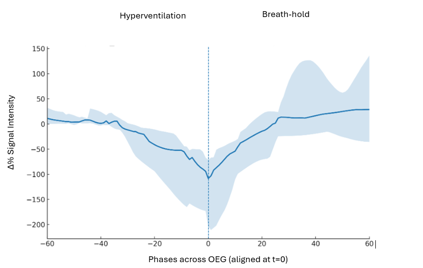 Figure 2. Brain–heart coupling. Relationship between cardiac B-MORE and brain B-CORE (Slice 1). The line shows a least-squares fit with 95% CI. Spearman ρ=0.41, p=0.020. Positive slope indicates that greater cardiac vasodilation is associated with greater cerebral vasodilation.