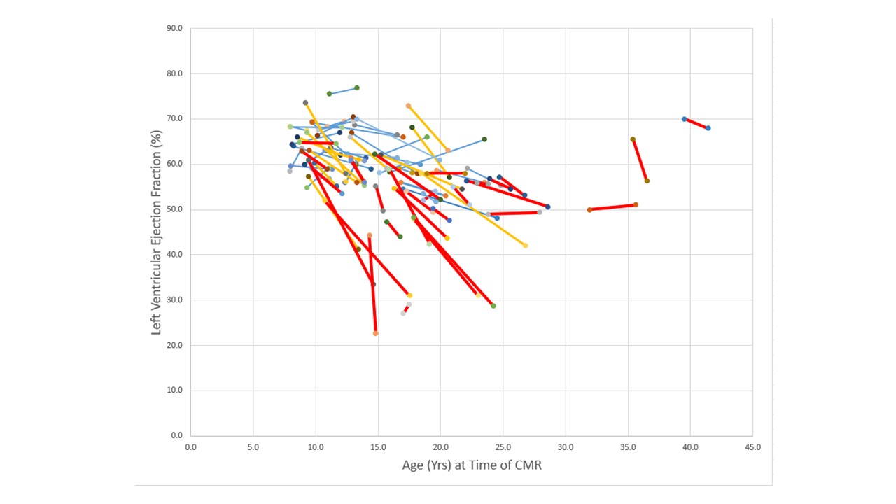 Figure 2: Longitudinal Scatter Plot of LGE Negative (blue lines), LGE negative converted to LGE positive (yellow lines) an LGE positive patients (red lines)