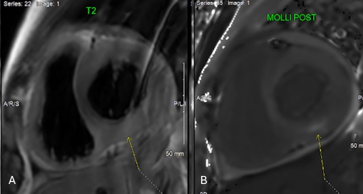 Figure 2: A. T2Weighted image short axis of LV showing increased hyperintensity (arrow). B. Post contrast Modified Look-Locker sequence showing area devoid of contrast uptake (arrow).
