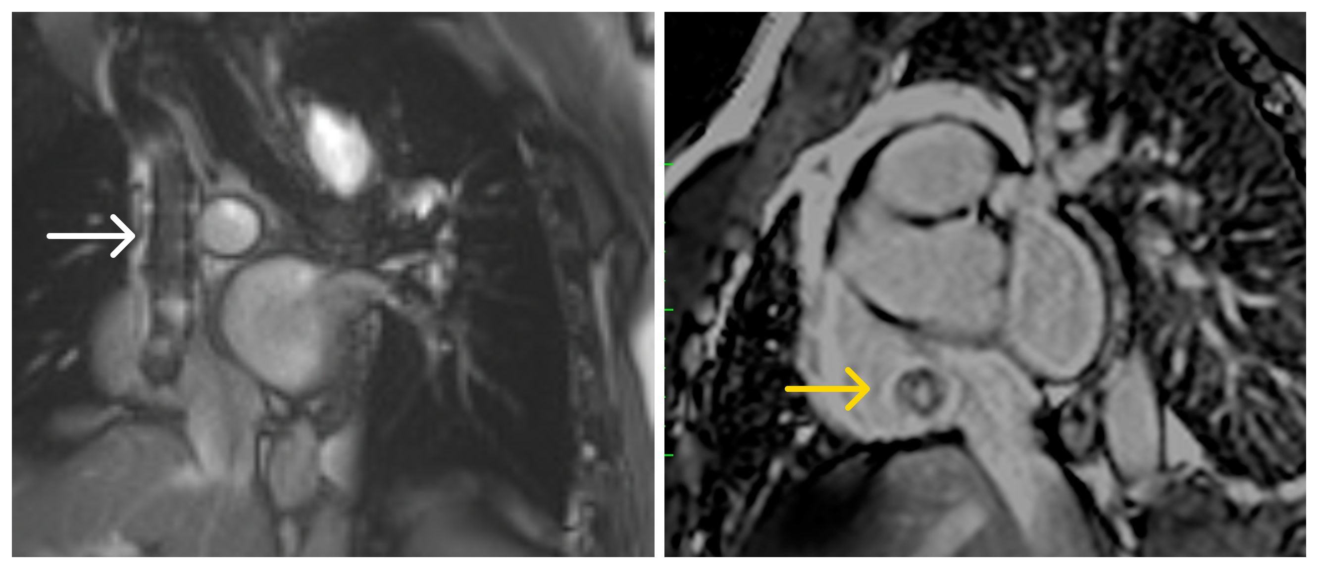 Image 2: Cardiac magnetic resonance. Left: tubular structure in the SVC with susceptibility artifact extending into the RA (white arrow). Right: single-shot LGE PSIR demonstrating contrast opacification within the stent lumen, consistent with preserved flow (yellow arrow).