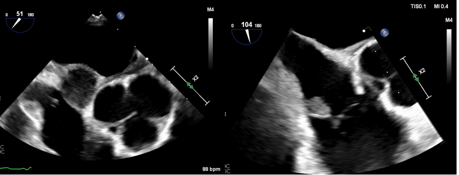 Transesophageal echocardiogram showing homogenous mass within the inter-atrial septum (left). Transesophageal echocardiogram demonstrating tricuspid vegetation (right)..png)
