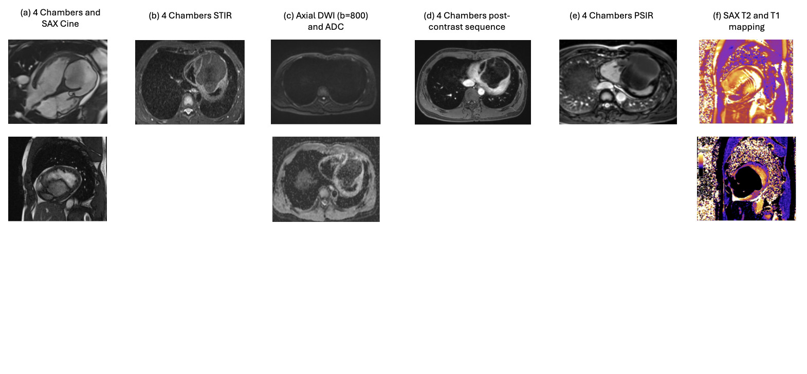 Figure 2. Multimodality CMR and tissue characteristics. (a) Four-chamber and short-axis cine sequences demonstrate a large multilobulated (septated) mass occupying the apical left ventricle and protruding into the right ventricular cavity. (b) Four-chamber STIR imaging shows homogeneous suppressed signal without edema. (c) Axial diffusion-weighted imaging (b = 800) and ADC map confirm absence of diffusion restriction. (d) Four-chamber post-contrast sequence shows no abnormal enhancement. (e) Four-chamber PSIR late gadolinium enhancement sequence confirms absence of contrast uptake, consistent with a benign lesion. (f) Short-axis T1 and T2 mapping demonstrate relaxation times compatible with fat-containing tissue (comparable with subcutaneous fat). Abbreviations: ADC = Apparent Diffusion Coefficient; CMR = Cardiac Magnetic Resonance; DWI = Diffusion-Weighted Imaging; PSIR = Phase-Sensitive Inversion Recovery; SAX = Short Axis; STIR = Short Tau Inversion Recovery..jpg)