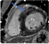 Fibrosis in the basal anteroseptal wall segment and in the apical lateral wall segment, with an estimated fibrosis mass of 17%