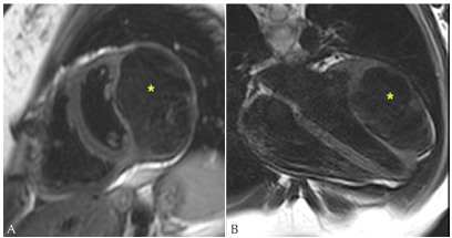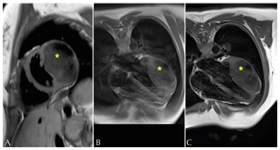 Figure 2: Short axis (A) and four-chamber (B-C), presenting intramyocardial mass (*) isointense in T1. 2016 (A), 2018 (B), and 2020 (C).