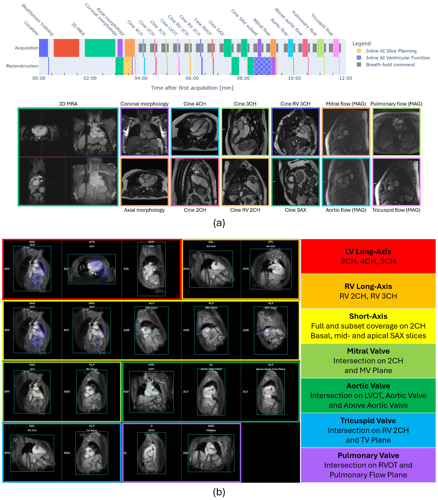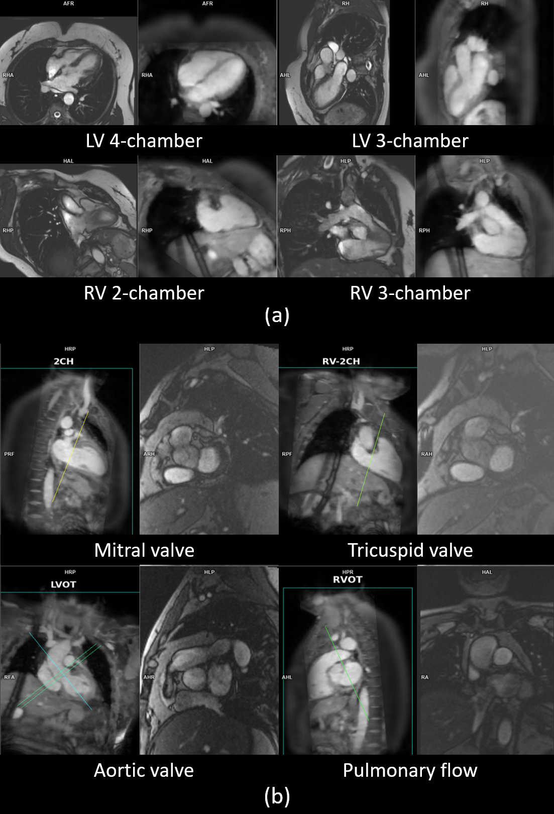 Figure 2: Examples of low scores. (a) Cases where an “Incorrect (0)” score was given for the cine, but the corresponding MPR was rated “Excellent (2)”, indicating a breath-hold mismatch rather than a misdetection of the AI algorithm. (b) Cases where an “Acceptable (1)” score was given, either due to suboptimal angulation (mitral, tricuspid, pulmonary) or too low position of the aortic valve.