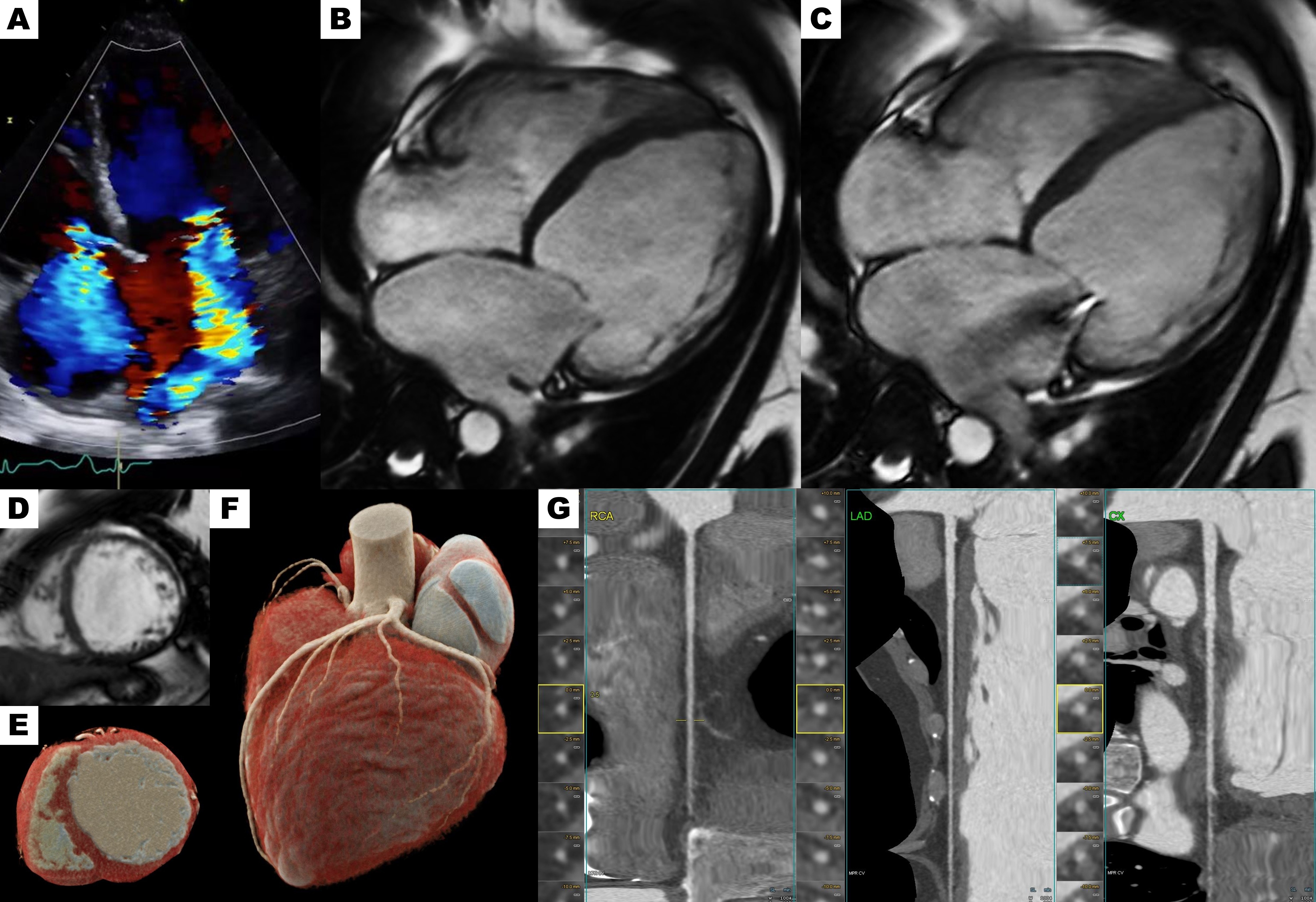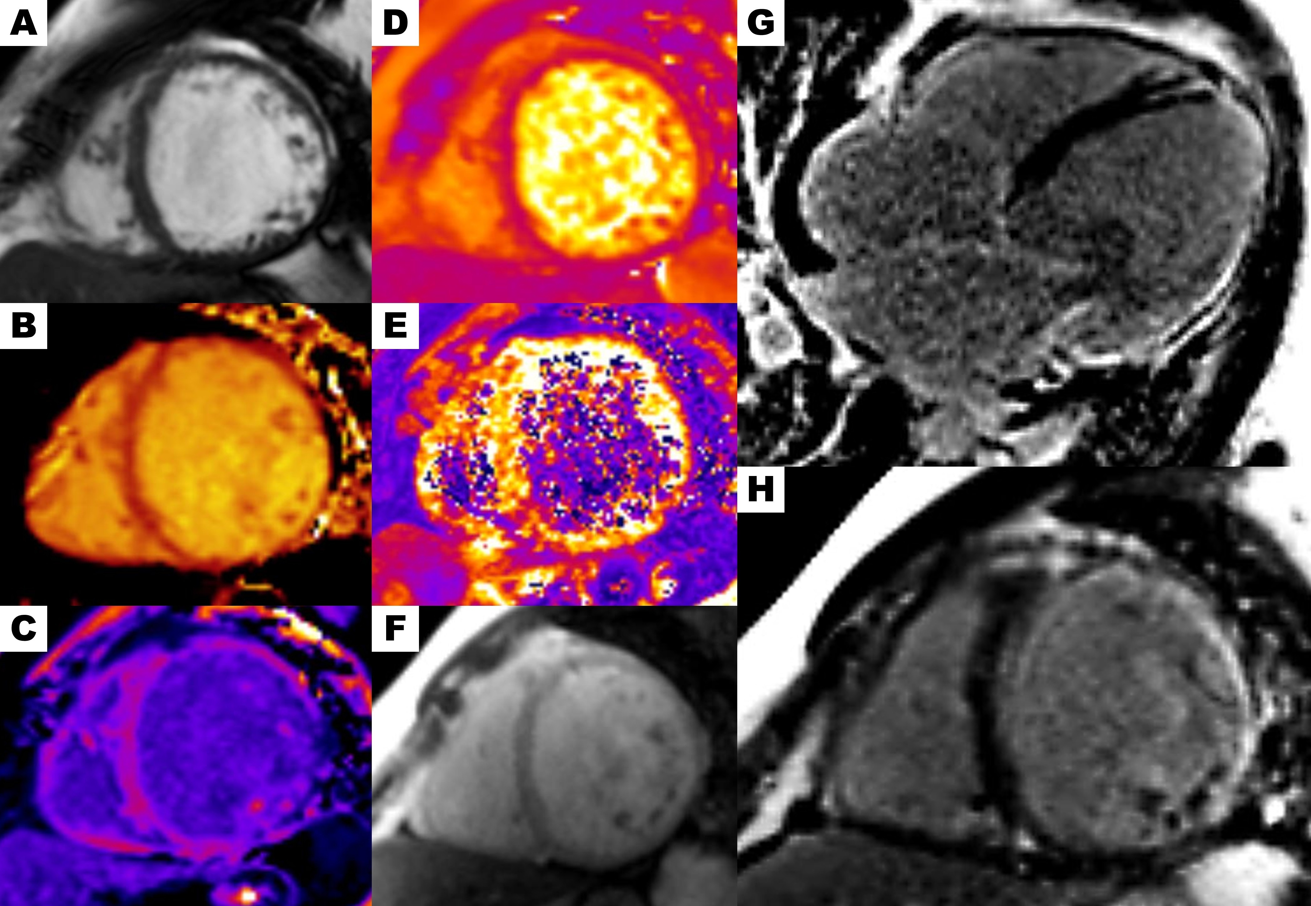 Figure 2. Cardiac magnetic resonance. (A) Balanced steady-state free precession cine short-axis view. (B) Elevated native T1 mapping values in the lateral wall across all three segments (1,124 ms). (C) Post-contrast T1 mapping showing an extracellular volume of 38%. (D) T2 mapping within the normal range. (E) T2* mapping within the normal range. (F) Short-axis first-pass perfusion demonstrating normal myocardial perfusion. Phase-sensitive inversion-recovery sequence showing LGE with transmural enhancement in the anterior, lateral, and inferior walls: (G) Four-chamber view, (H) Short-axis view.