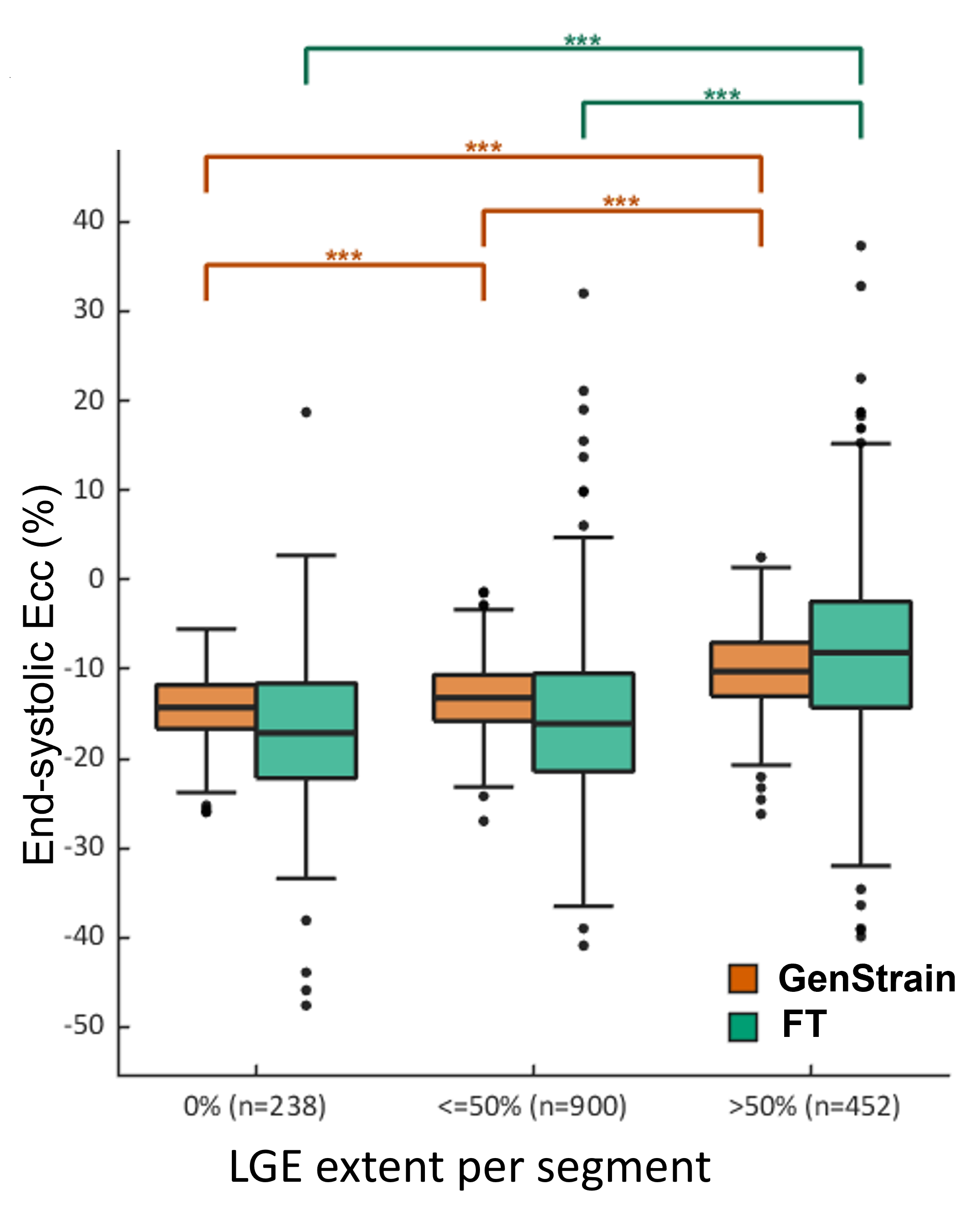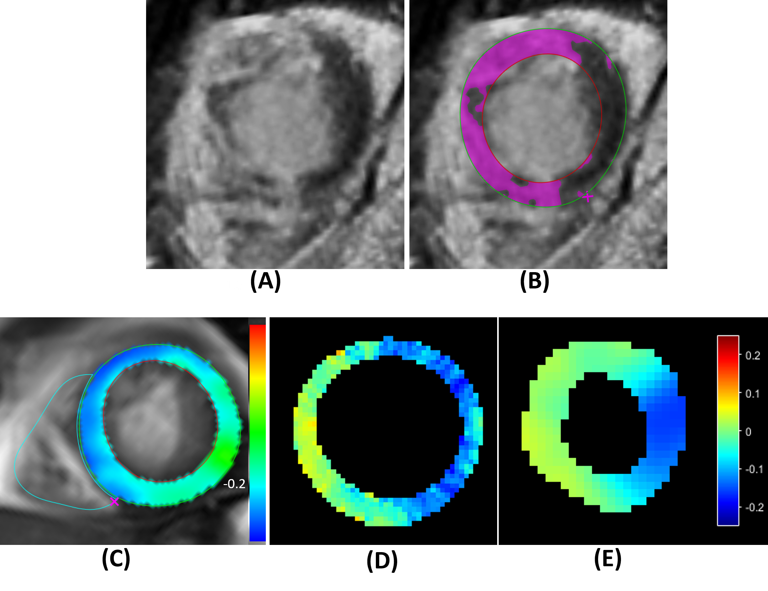 Fig. 3. Example LGE image (A) and map (B), and end-systolic strain maps at a matched location obtained by FT (C), GenStrain (D), and DENSE (E) from one patient.