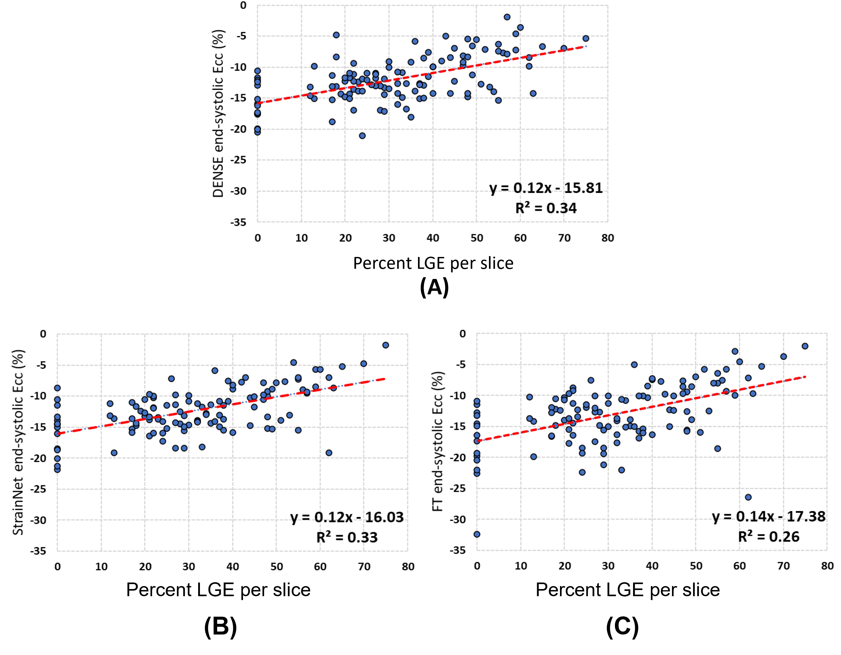 Fig. 2. Linear correlations between end-systolic whole-slice circumferential strain and the percent of late gadolinium per slice for (A) DENSE, (B) GenStrain and (C) FT, with R2 values of 0.34, 0.33, and 0.26, respectively.