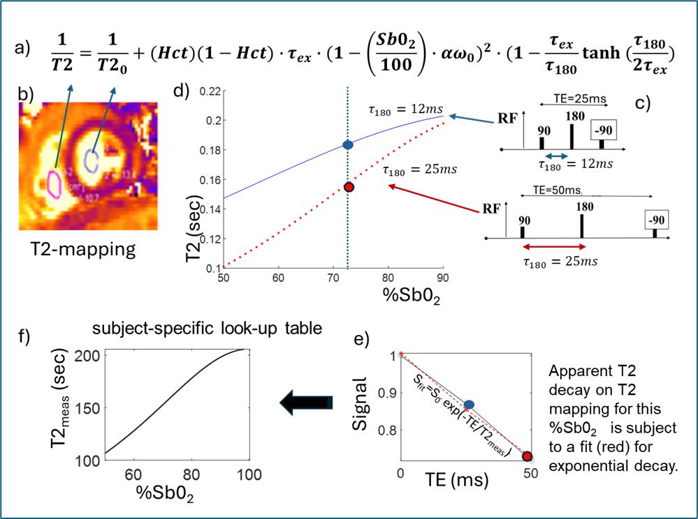 Figure 2: A) Blood T2 ratio is strongly correlated with measured oxygen saturations. B) Using framework with previously published constants, LV and RV T2 values were used to estimate oxygen saturations in the right heart, showing excellent absolute agreement. The Bland-Altman limits of agreement were 4.5%±11%.