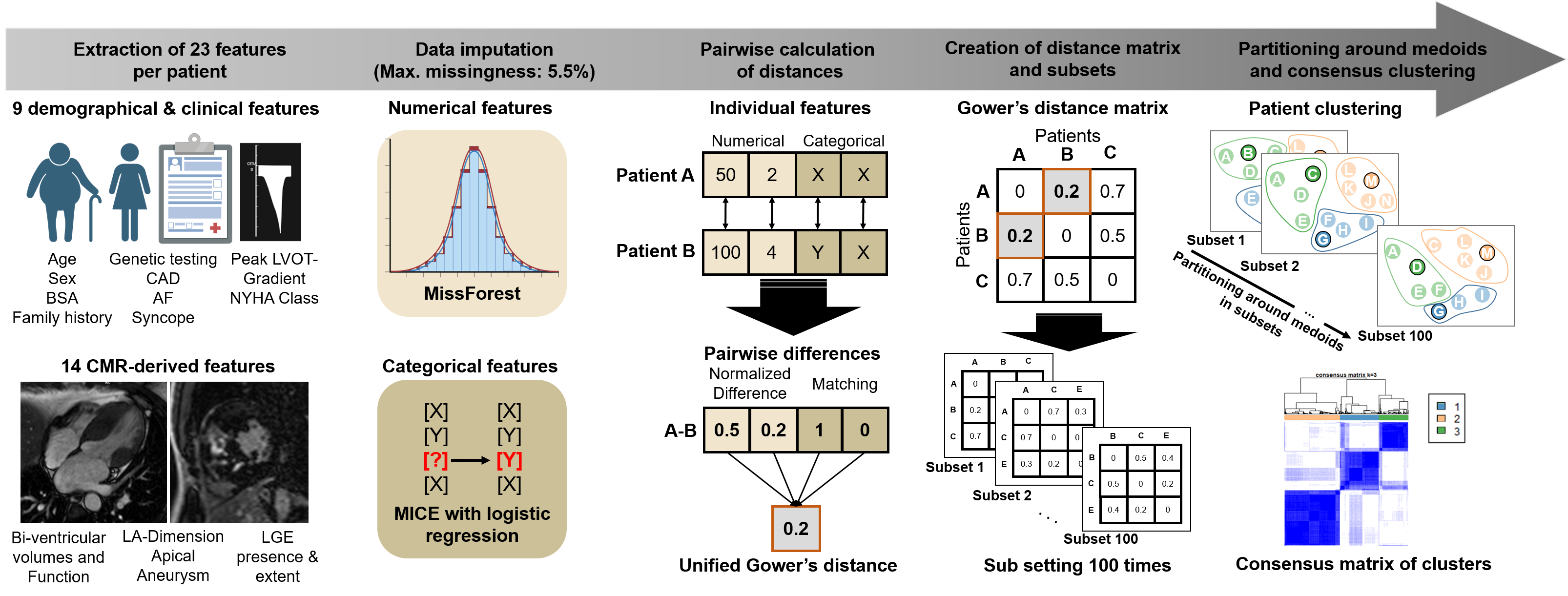 Continuous variables are presented as mean ± standard deviation and compared using either parametric t-tests or non-parametric Mann–Whitney U tests, as appropriate. Categorical variables are reported as frequencies with corresponding percentages and compared using the chi-squared test or Fisher’s exact test, where applicable.Abbreviations: BMI – body mass index; ICD – implantable cardioverter-defibrillator; NYHA – New York Heart Association; LVOT – left ventricular outflow tract; ACE – angiotensin-converting enzyme; ARB – angiotensin receptor blocker; LV/RV – left/right ventricle; LA – left atrium; WT – wall thickness; MI – mass index; EDVI/ESVI – end-diastolic/end-systolic volume index; SVI – stroke volume index; EF – ejection fraction; LGE – late gadolinium enhancement.Figure 1: Preprocessing of extracted features and unsupervised consensus clustering. A total of 23 features per patient (9 demographic and clinical variables, 14 CMR-derived features) were extracted. Missing data were imputed separately for numerical variables using the MissForest algorithm (based on a random forest model), and for categorical variables using multiple imputation by chained equations (MICE) with logistic regression models. The maximum missingness rate among features was 5.5%. Gower’s unified distance was then computed between individual patients by calculating differences in numerical and categorical features separately and combining them into a single distance metric. The resulting Gower distance matrix was resampled 100 times, each containing 80% of patients. Each of the 100 subsets was clustered using partitioning around medoids (PAM), and pairwise results were summarized in a consensus matrix to determine the optimal number of clusters. Abbreviations: BSA – body surface area; CAD – coronary artery disease; NYHA – New York Heart Association; AF – atrial fibrillation; LVOT – left ventricular outflow tract; LA – left atrium; LGE – late gadolinium enhancement.
