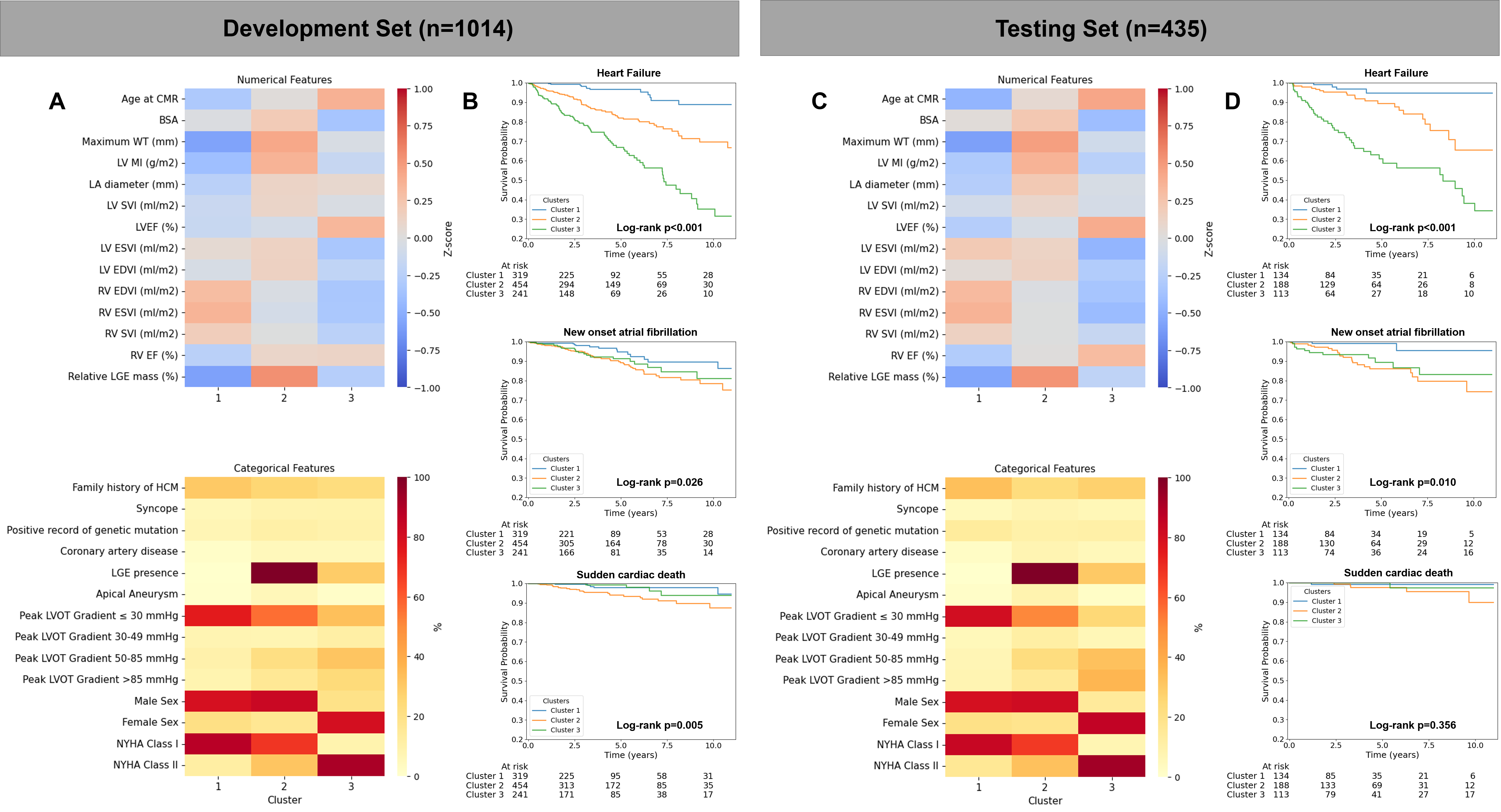 Figure 2. Patient clusters and adverse event rates across clusters in the development and testing set. Figure 2A and 2C display heatmaps of feature distributions across the identified clusters in the development and testing set. For numerical features, standardized Z-scores relative to the cohort mean are shown, with lower values (0 to -1) represented in shades of blue and higher values (0 to +1) in shades of red. For categorical features, the within-cluster frequency of each feature is visualized, with warmer colors indicating a higher proportion (%) of patients exhibiting that characteristic. Figure 2B and 2D show Kaplan–Meier survival curves for heart failure events, new-onset atrial fibrillation, and sudden cardiac death across the three clusters in the development and testing set, demonstrating differences in event rates for all outcomes between clusters. Abbreviations: BSA – body surface area; CAD – coronary artery disease; LV/RV – left/right ventricle; LA – left atrium; MI – mass index; EDVI/ESVI – end-diastolic/end-systolic volume index; SVI – stroke volume index; EF – ejection fraction; LGE – late gadolinium enhancement; WT – wall thickness; LVOT – left ventricular outflow tract; NYHA – New York Heart Association