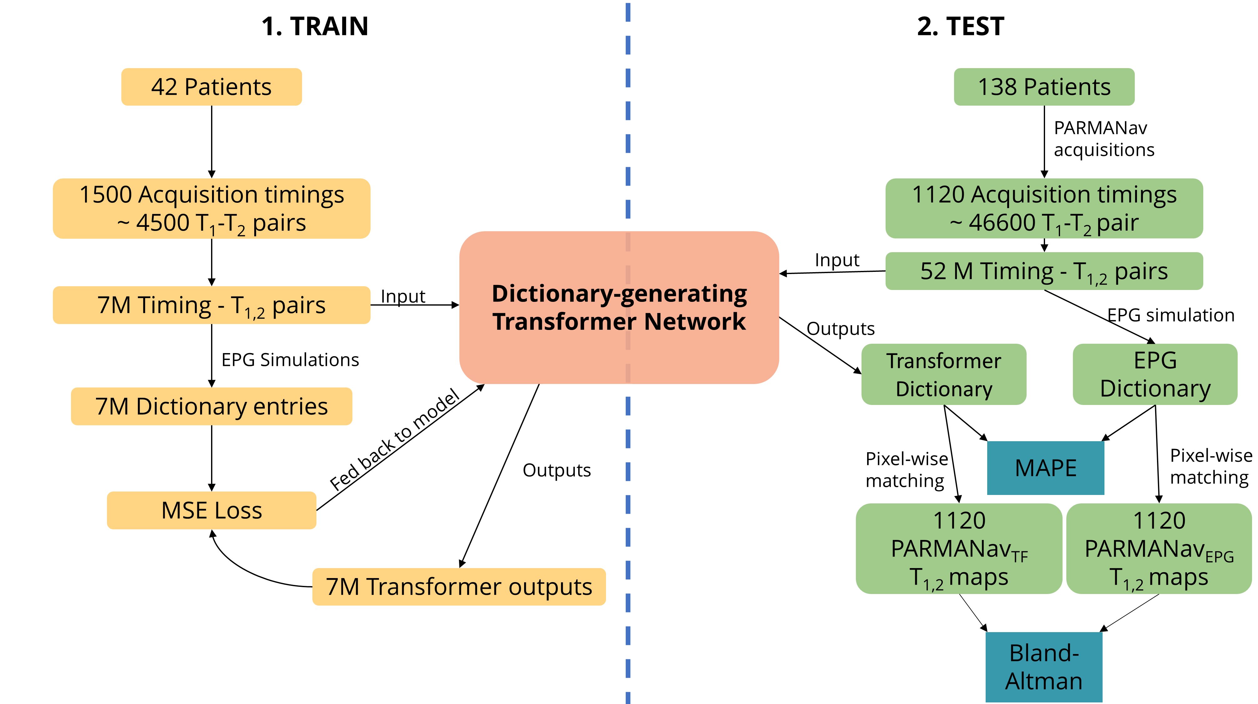 Figure 3. A Histograms of T1 and T2 MAPE across all test patients, comparing the dictionaries for the Transformer and the baseline MLP model. Bin size 0.06. B Average MAPE per number of total skips (due to navigator rejection or ECG trigger detection failure) during the scan, for both models, bin size 5. C Exemplary comparison of maps created with the PARMANav EPG dictionary and the PARMANav Transformer dictionary. D Difference plot (Transformer Model - EPG). The maps are visually identical.