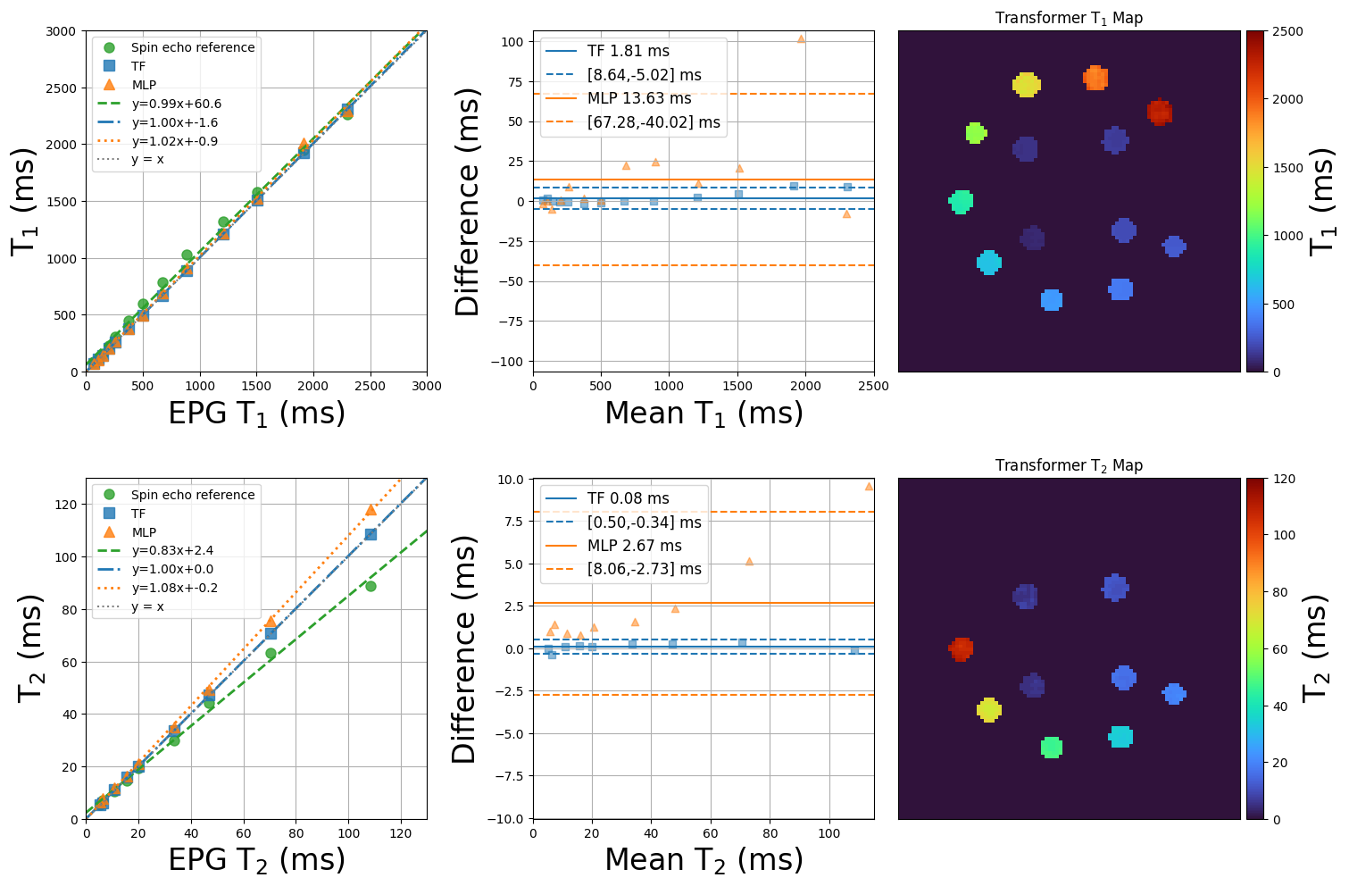 Figure 2: Values of the spin echo reference and the models in the phantom compared to the EPG, alongside the Bland-Altman plot using the Transformer model dictionary, and the maps of the scanned phantom. For T2, values larger than 120 were omitted.