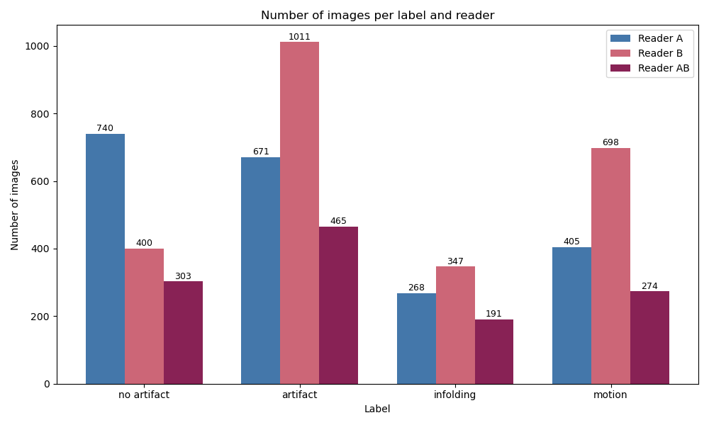 Figure 2: Label distribution by number of images per class and reader.