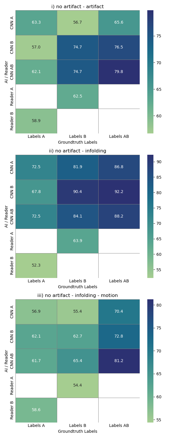 Figure 3: Resulting mean recall in percent for the nine CNNs. Scenario i) shows the binary classifier for ‘no artifact’ vs ‘artifact’, scenario ii) shows the classifier for differentiating ‘no artifact’ from ‘infolding’ and scenario iii) the multi-label approach for ‘no artifact’, ‘infolding’ and ‘motion’. The letter at the CNN indicates on which labels the CNN was trained and validated, the different columns provide which labels were used for testing the CNN. The two lower rows in the three subfigures show how reader A performed compared to ground truth labels B and vice versa for all scenarios. Note that the inter-reader mean recall of reader A and reader B for scenarios i) and iii) is similar to the performance of CNNA and CNNB respectively — that is, CNNA is compared to reader A, and CNNB to reader B. However, in scenario ii), CNNA outperforms reader A, and CNNB outperforms reader B when classifying infoldings versus artefact-free images, even though both CNNs were trained on labels from the respective human reader..png)
